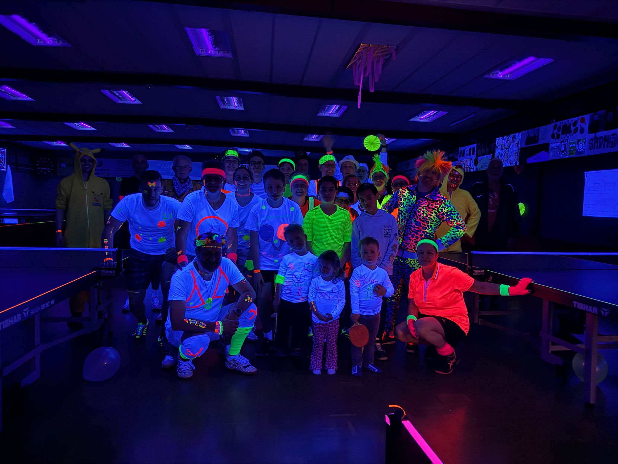 Licht uit, spot aan! Of beter gezegd licht uit en bal aan! Na het harde voorbereidende werk van diverse mensen was de speelzaal er helemaal klaar voor. De ramen geblindeerd, alle TL buizen vervangen, omheiningen en tafels beplakt met lichtgevend tape, versieringen opgehangen en niet te vergeten lichtgevende balletjes opgespoord. Dit alles om er voor te zorgen dat op 23 februari wij als TTV Stiphout dit unieke evenement konden beleven. Namelijk het Neon Carnavals toernooi! Waarin de spelers (29 in totaal) verkleed in carnavals en/of neon-outfit het tegen elkaar opnamen in een zaal met enkel blacklight verlichting.