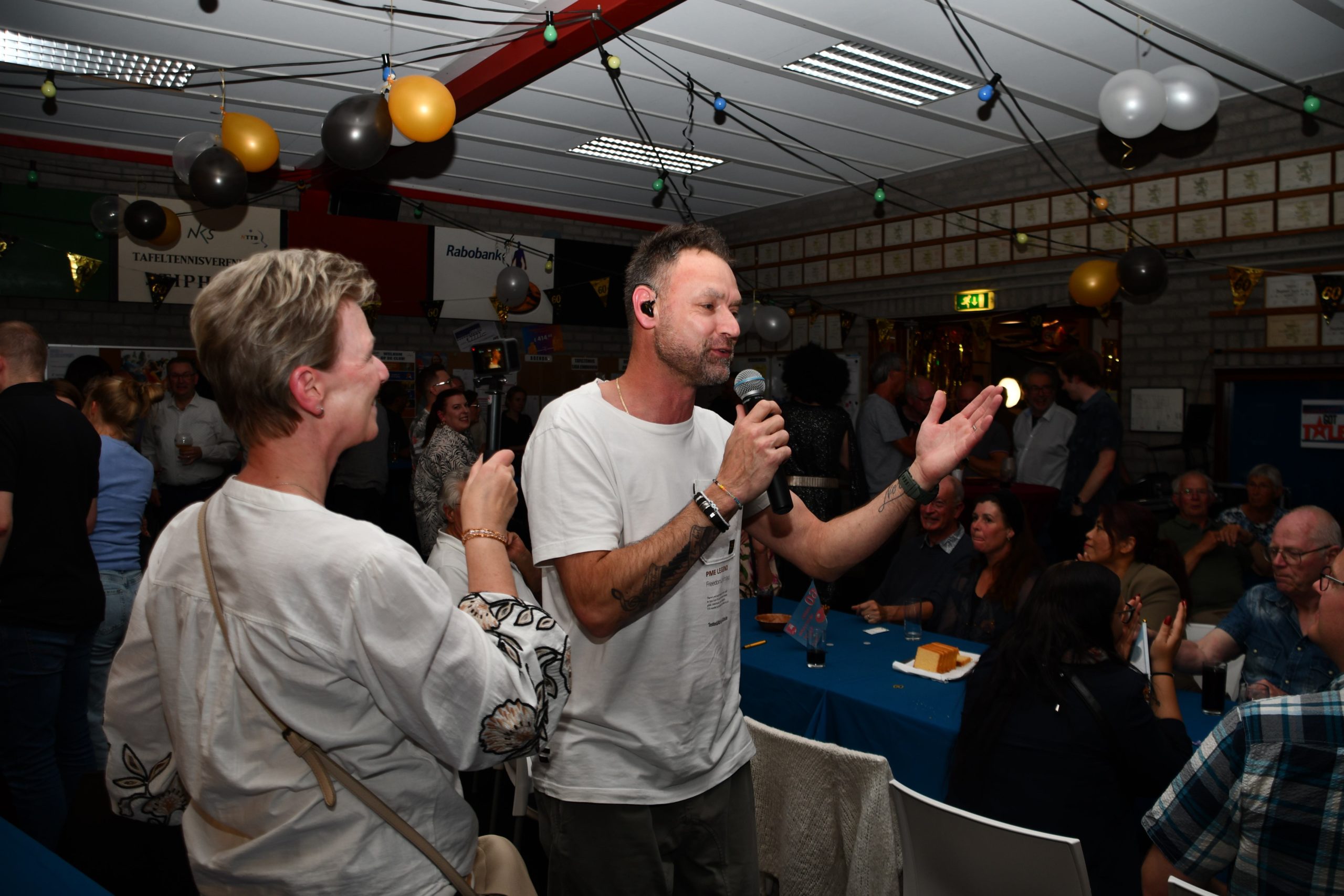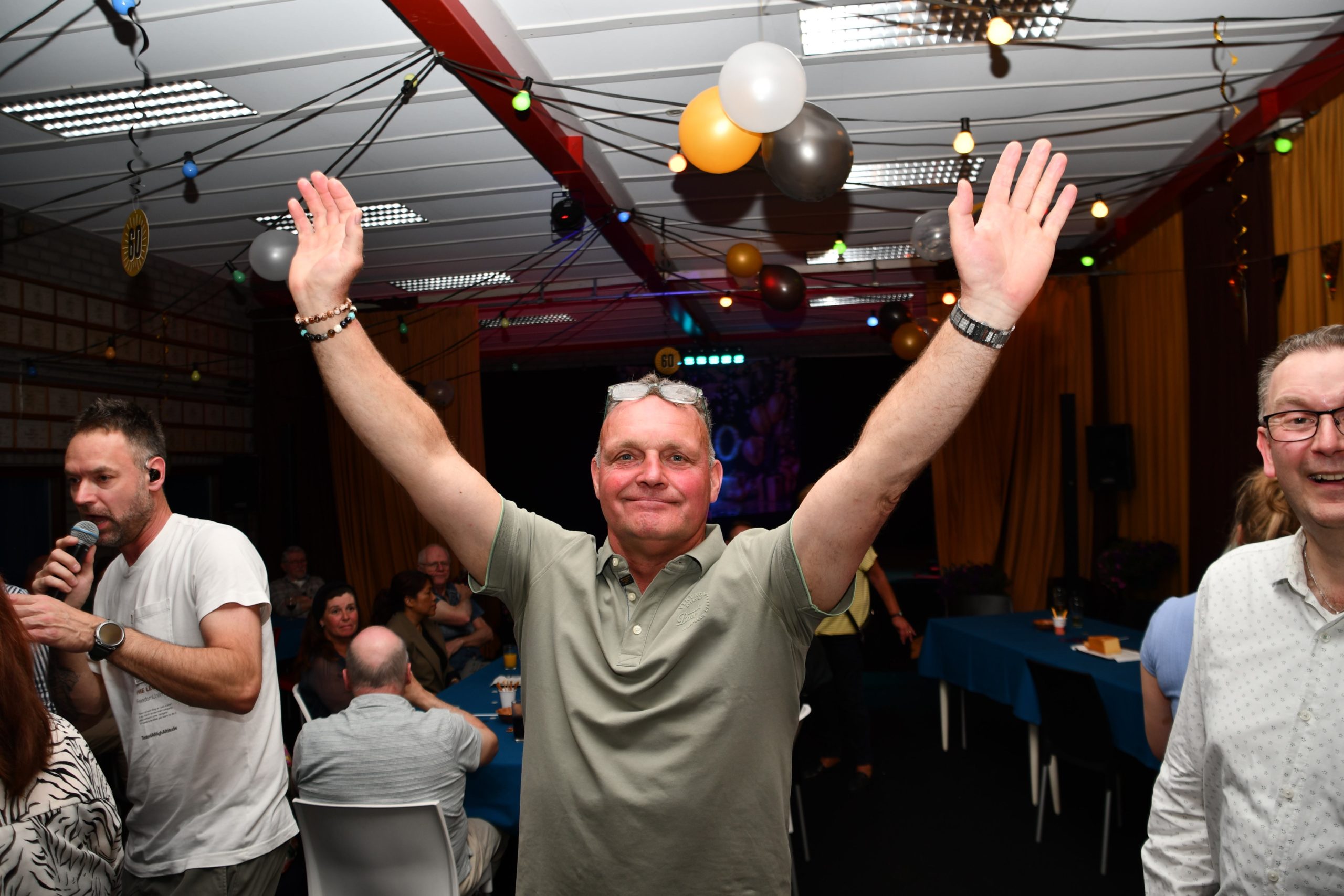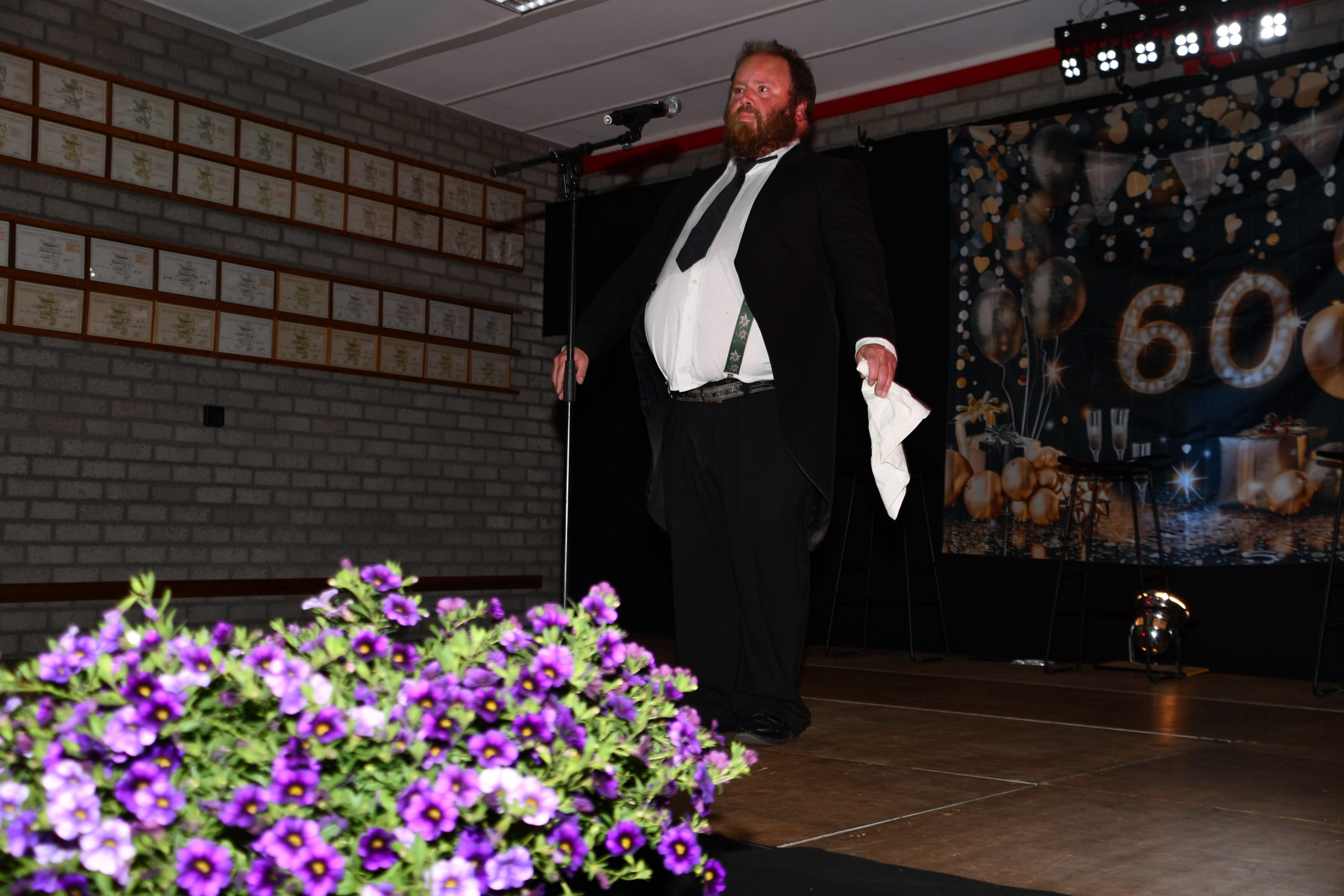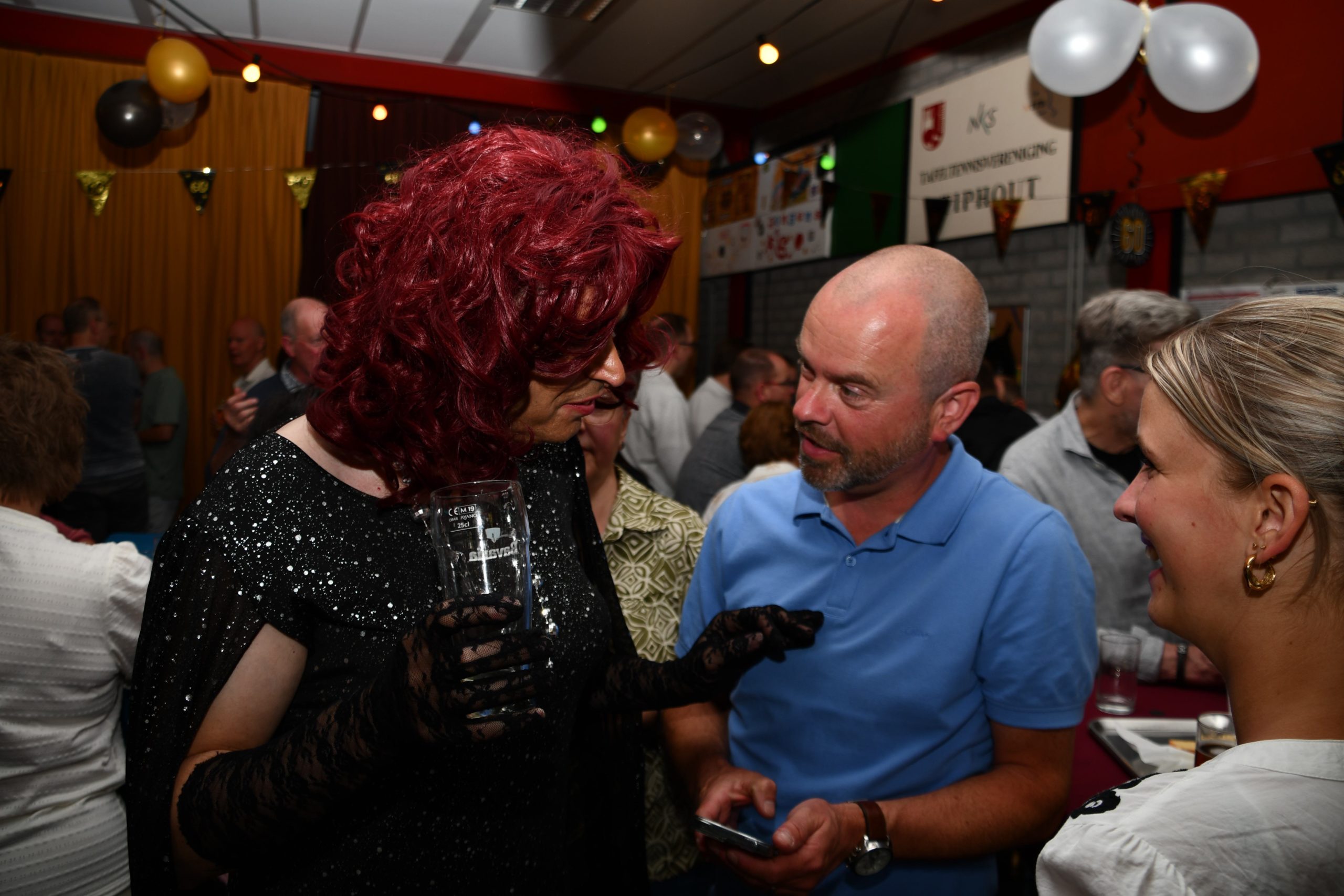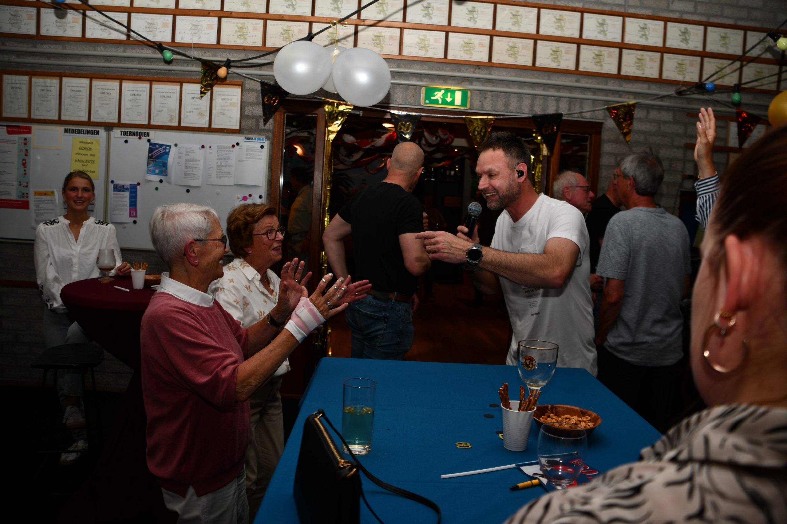 Dan is het tijd voor de hoofdact van de avond. Maurice Schalks maakt er een feestje van. Hij krijgt de zaal goed aan het dansen en mengt zich in het publiek. Zo ontstaat er al bij het eerste nummer een lange polonaise vol hossende en licht bezweette feestvierders. Ook hij moet even op adem komen en in de tussentijd kunnen we het enige kampioensteam van dit seizoen het podium op roepen: Stiphout 3! Ze hebben een topprestatie geleverd en ze gaan met een grote glimlach en een bierpakket onder de arm het podium weer af. Daarna is het de beurt aan Renée die al 40 jaar lid is van onze club. William haalt de oude herinneringen op met de zaal en ze krijgt dan ook een luid applaus en een bloemetje.
