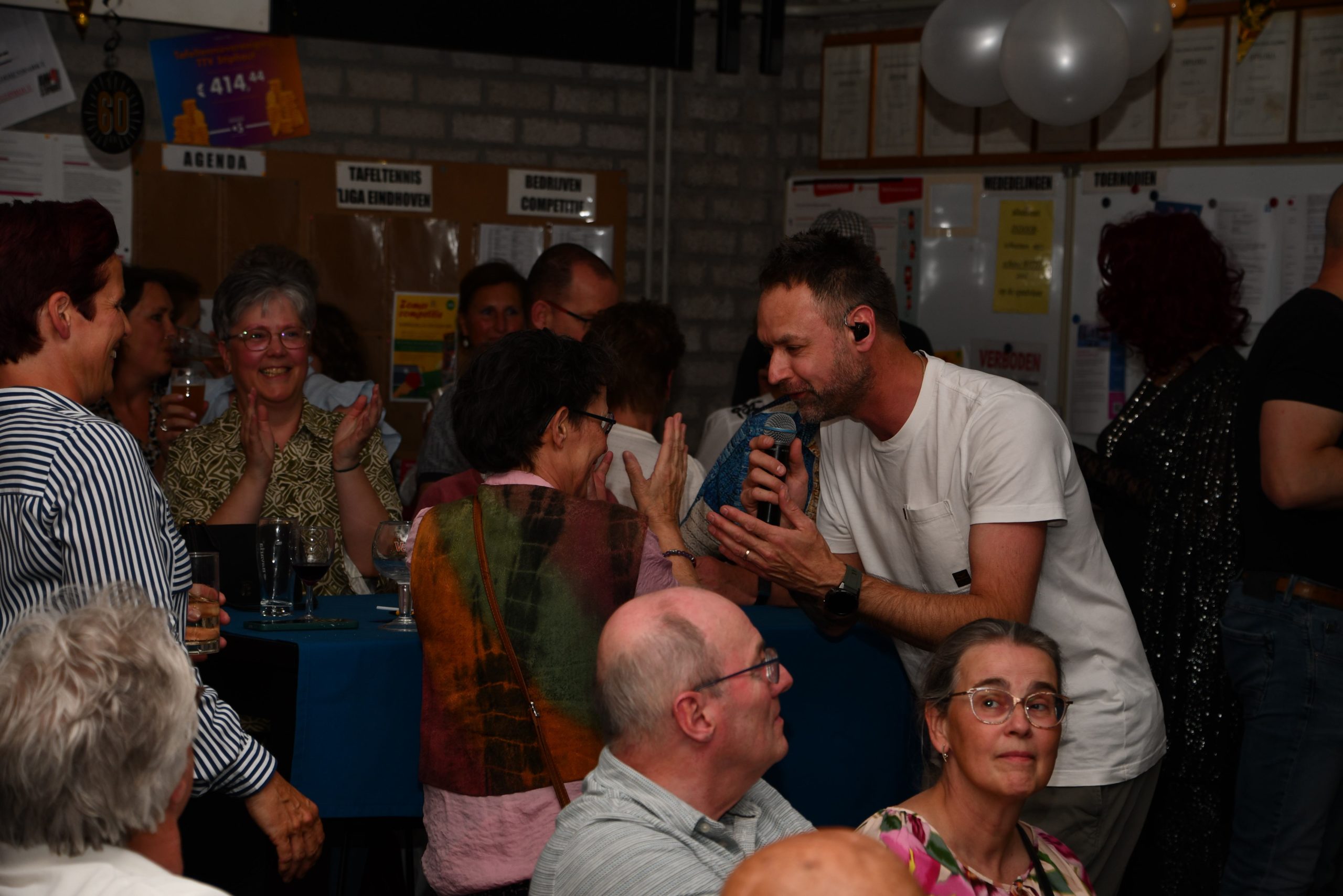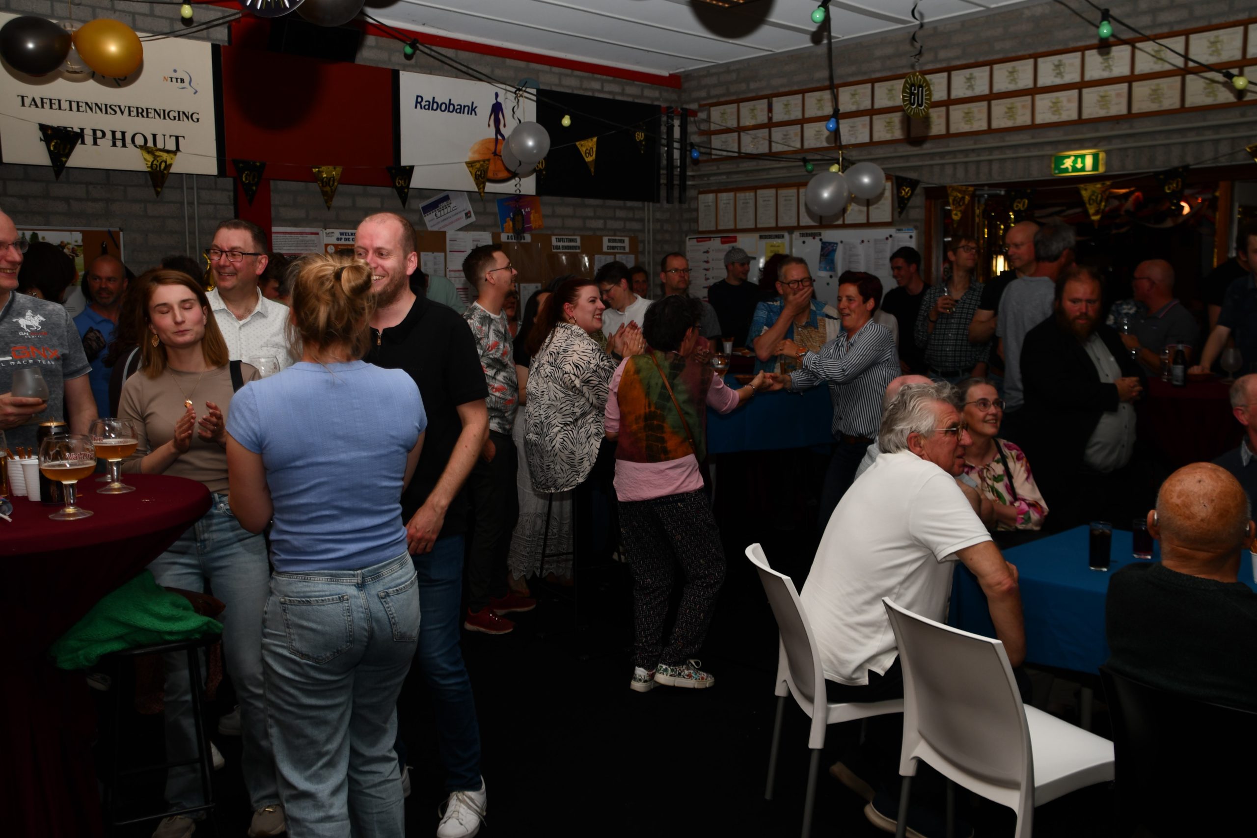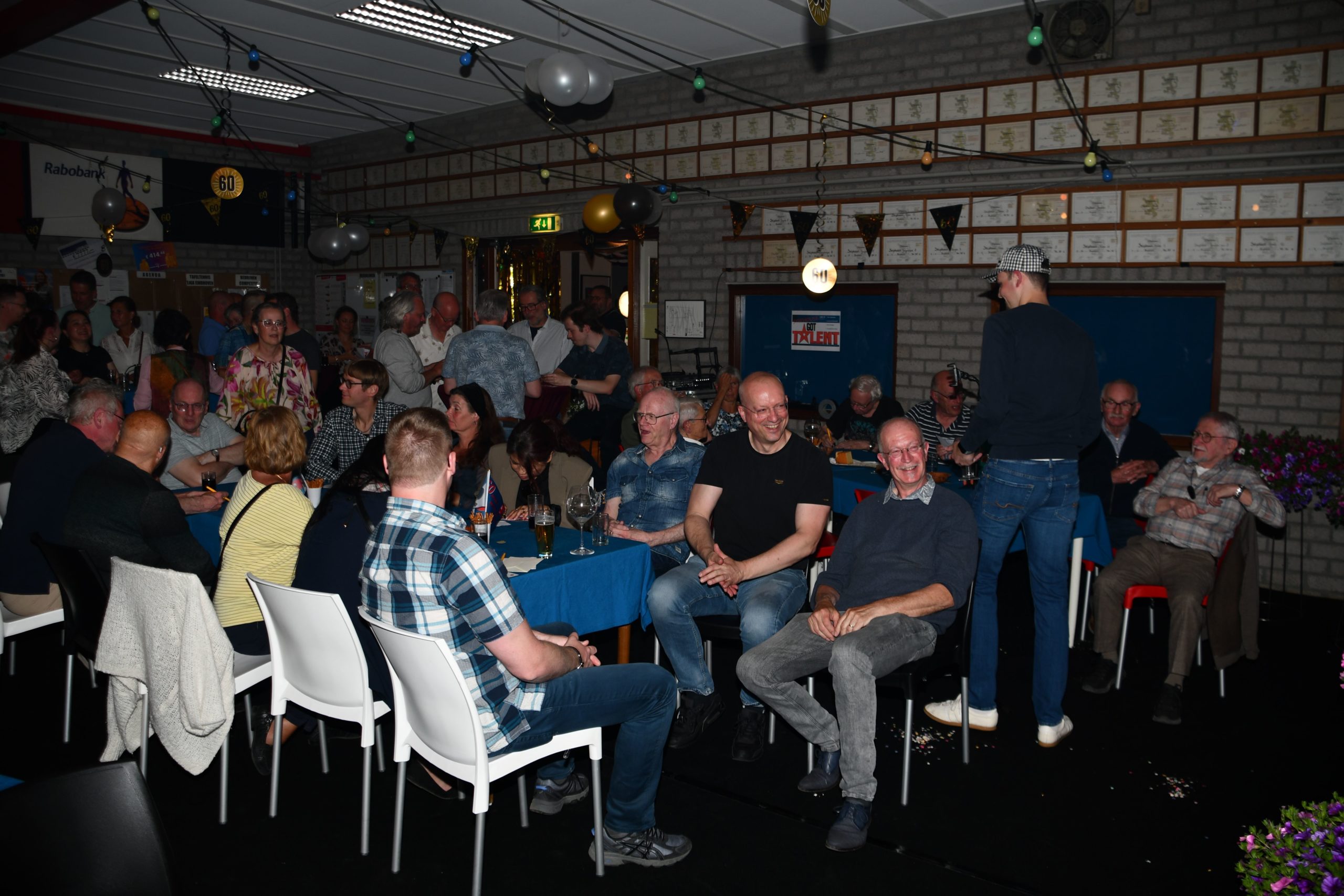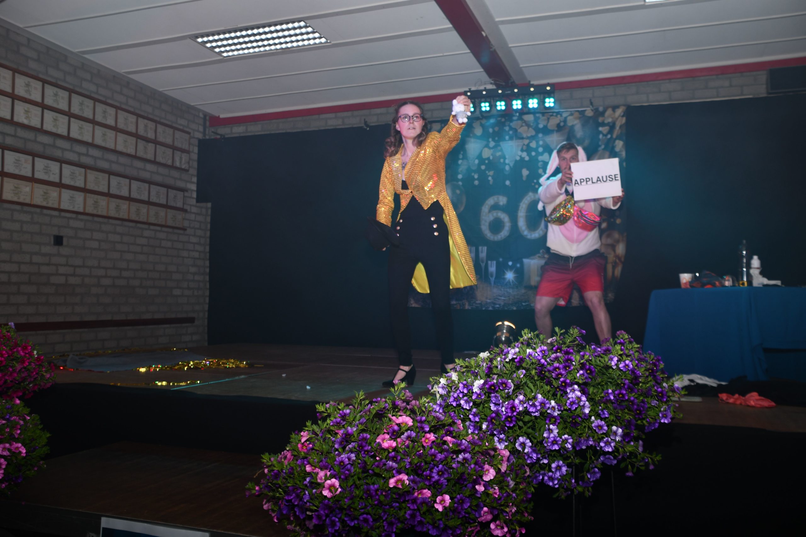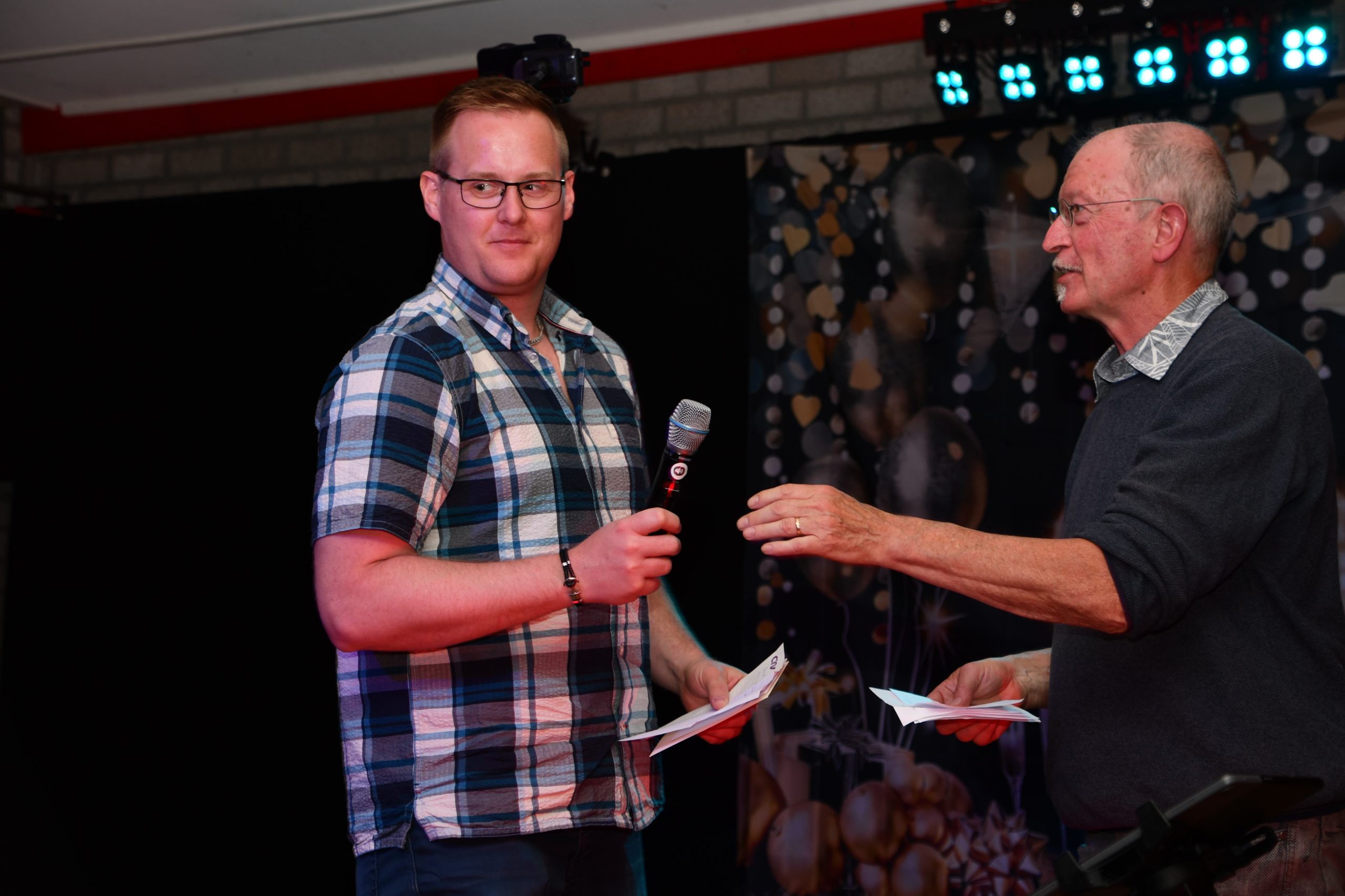 Dan is het tijd voor de hoofdact van de avond. Maurice Schalks maakt er een feestje van. Hij krijgt de zaal goed aan het dansen en mengt zich in het publiek. Zo ontstaat er al bij het eerste nummer een lange polonaise vol hossende en licht bezweette feestvierders. Ook hij moet even op adem komen en in de tussentijd kunnen we het enige kampioensteam van dit seizoen het podium op roepen: Stiphout 3! Ze hebben een topprestatie geleverd en ze gaan met een grote glimlach en een bierpakket onder de arm het podium weer af. Daarna is het de beurt aan Renée die al 40 jaar lid is van onze club. William haalt de oude herinneringen op met de zaal en ze krijgt dan ook een luid applaus en een bloemetje.