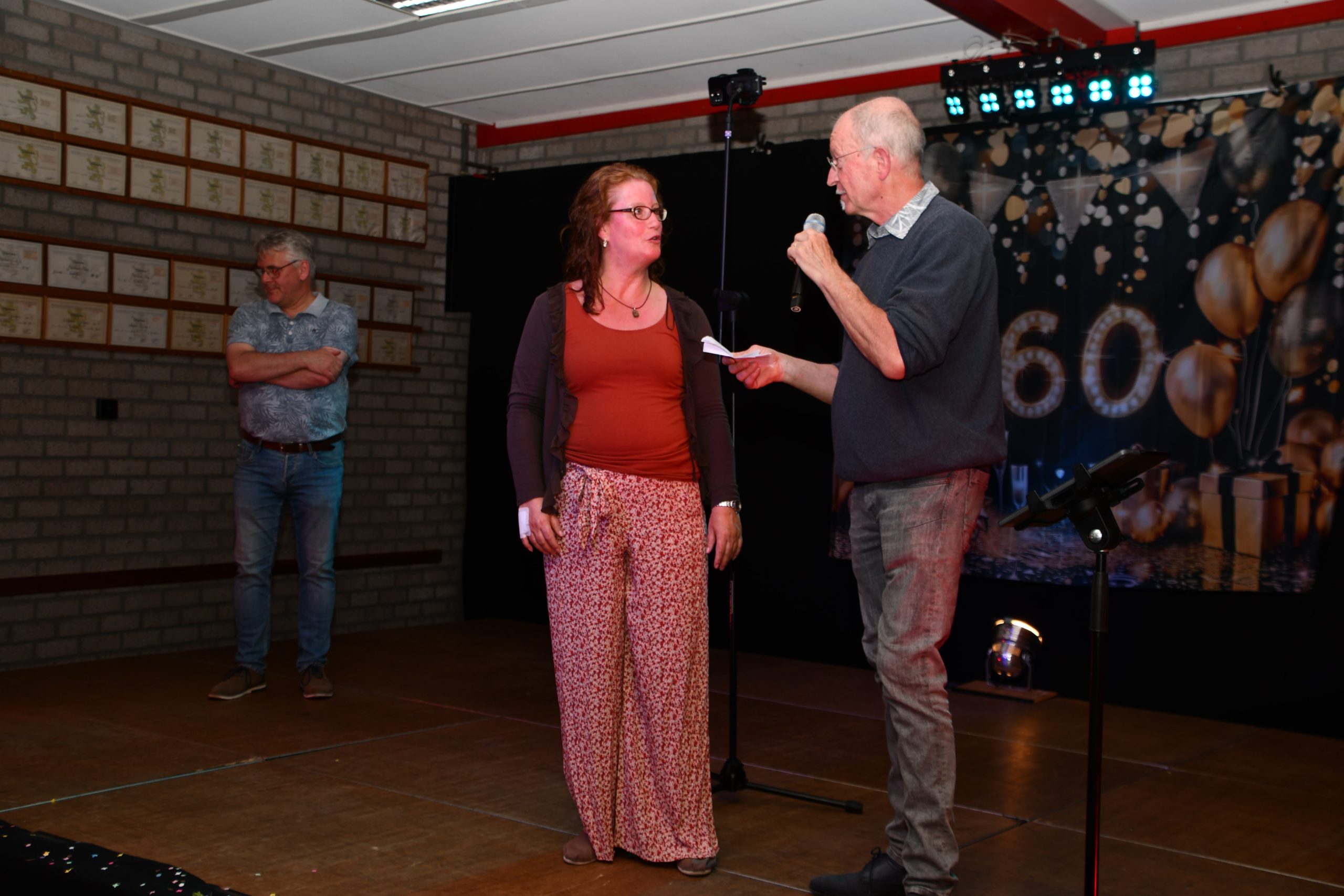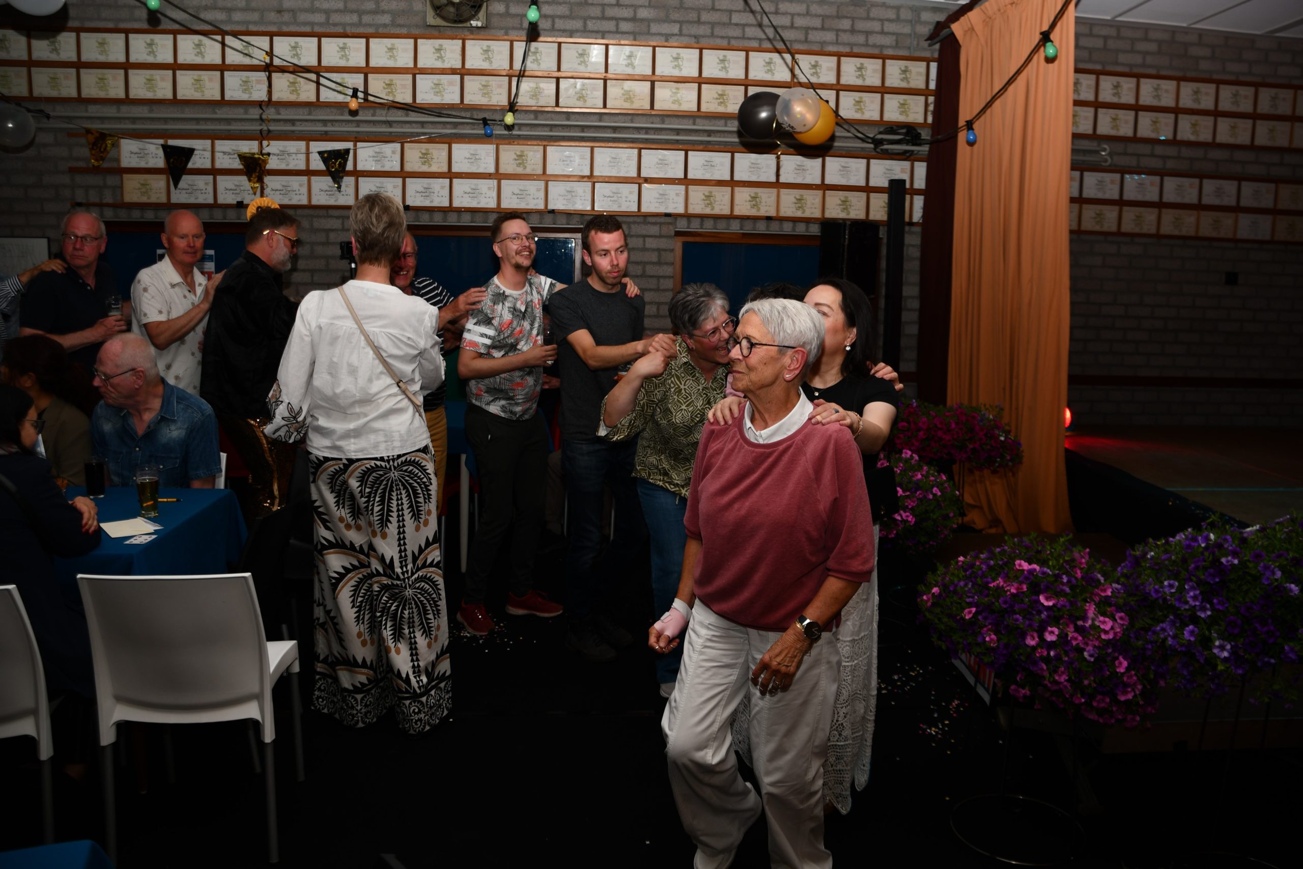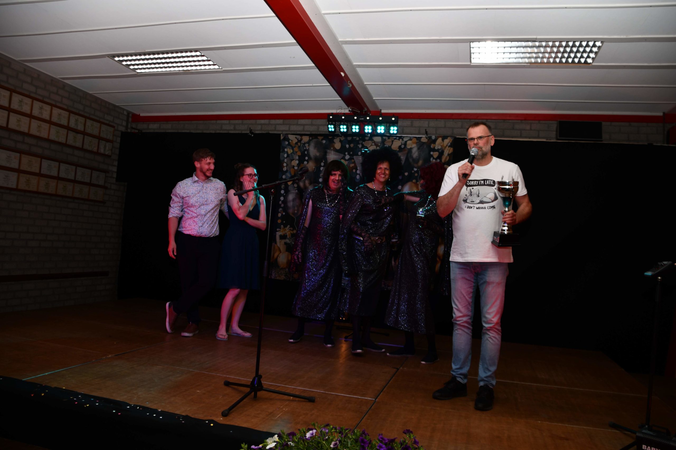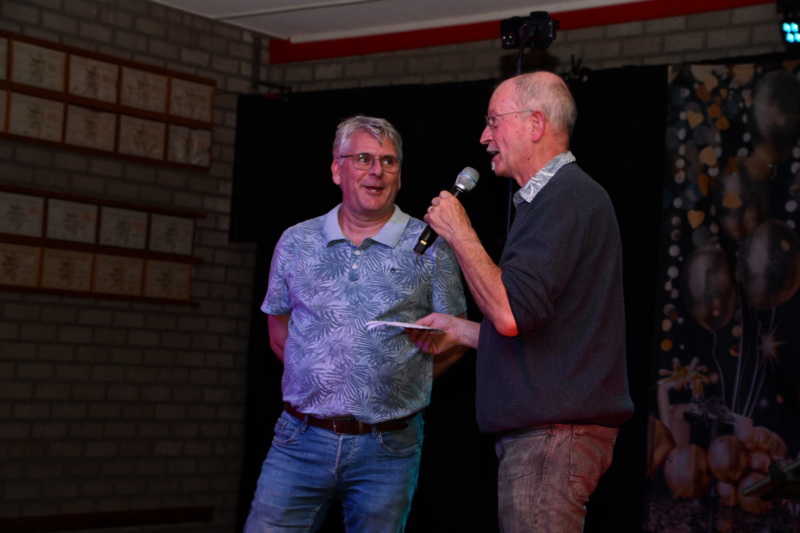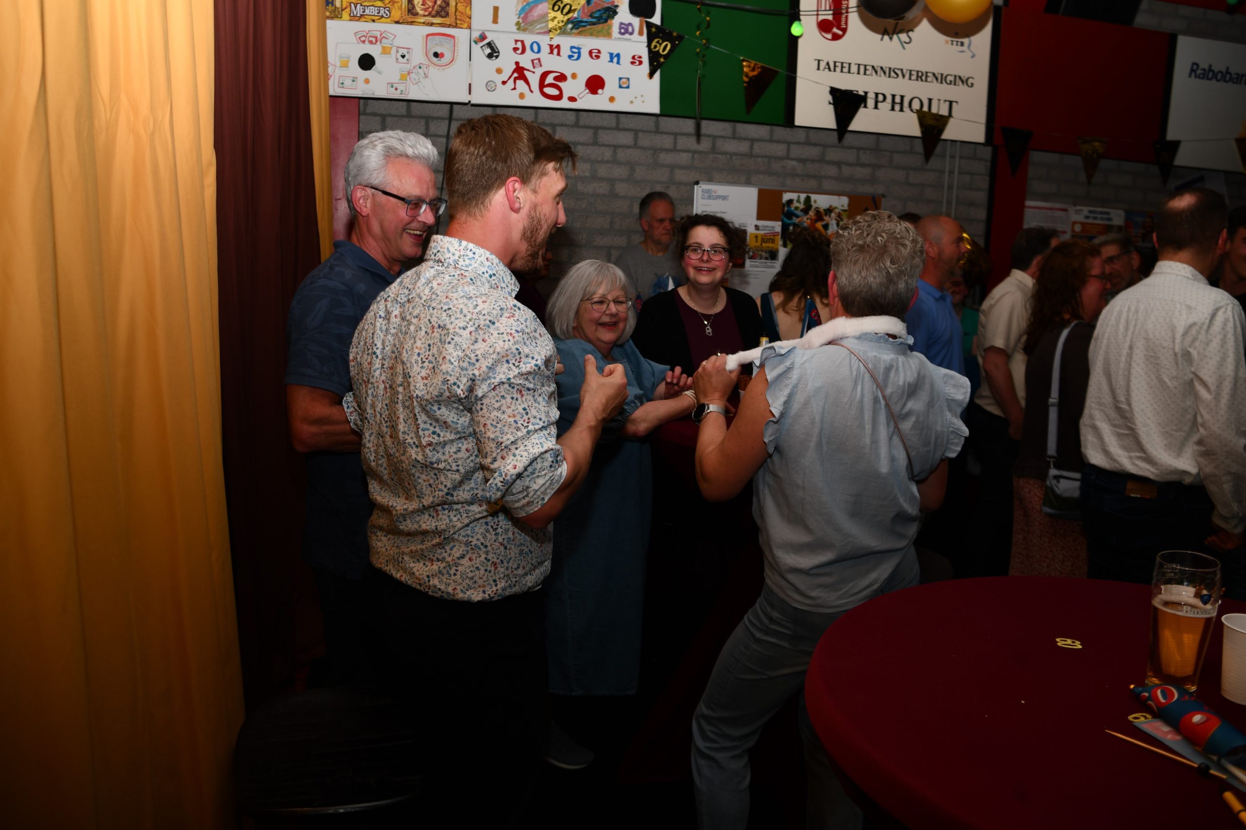 Dan is het tijd voor de hoofdact van de avond. Maurice Schalks maakt er een feestje van. Hij krijgt de zaal goed aan het dansen en mengt zich in het publiek. Zo ontstaat er al bij het eerste nummer een lange polonaise vol hossende en licht bezweette feestvierders. Ook hij moet even op adem komen en in de tussentijd kunnen we het enige kampioensteam van dit seizoen het podium op roepen: Stiphout 3! Ze hebben een topprestatie geleverd en ze gaan met een grote glimlach en een bierpakket onder de arm het podium weer af. Daarna is het de beurt aan Renée die al 40 jaar lid is van onze club. William haalt de oude herinneringen op met de zaal en ze krijgt dan ook een luid applaus en een bloemetje.