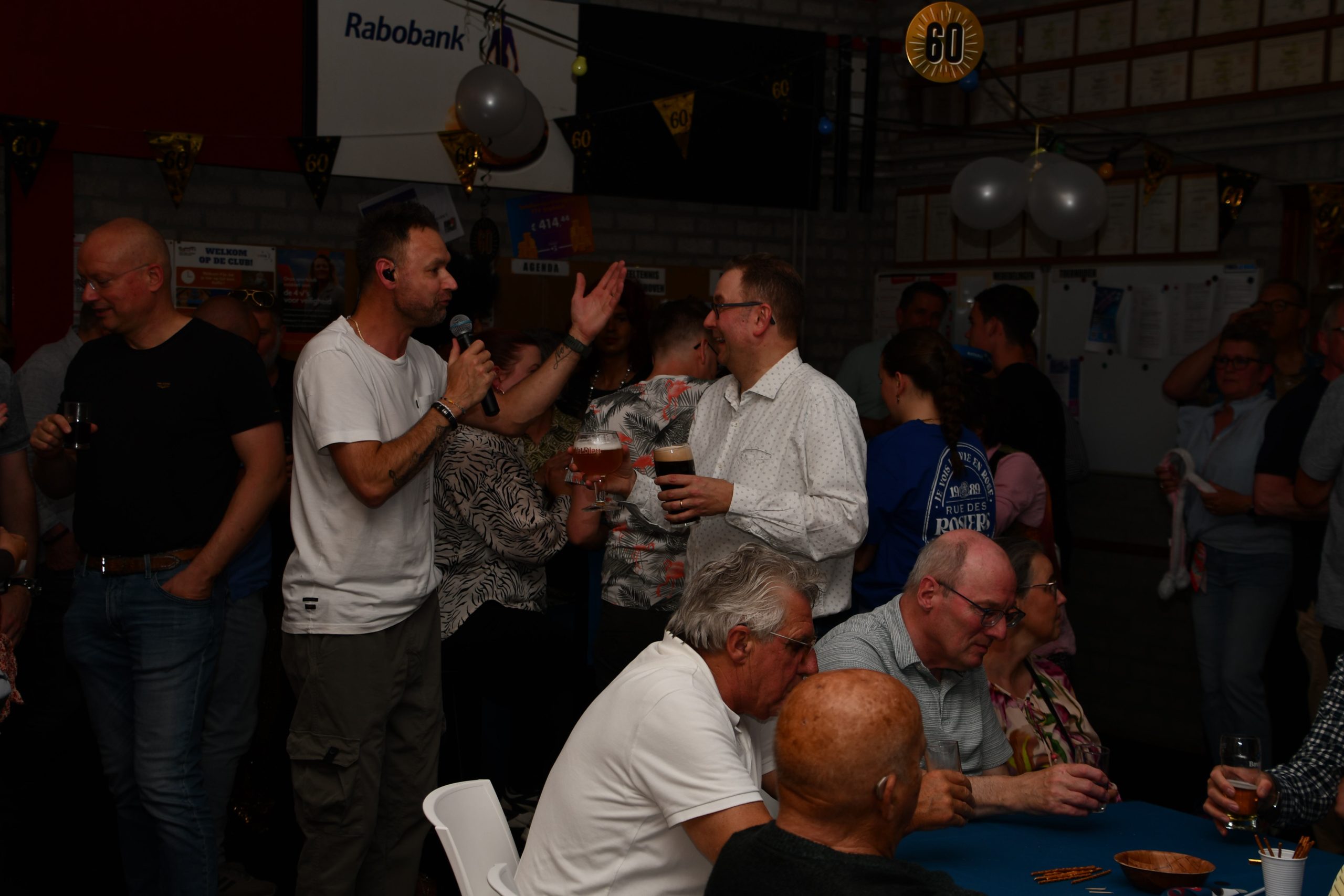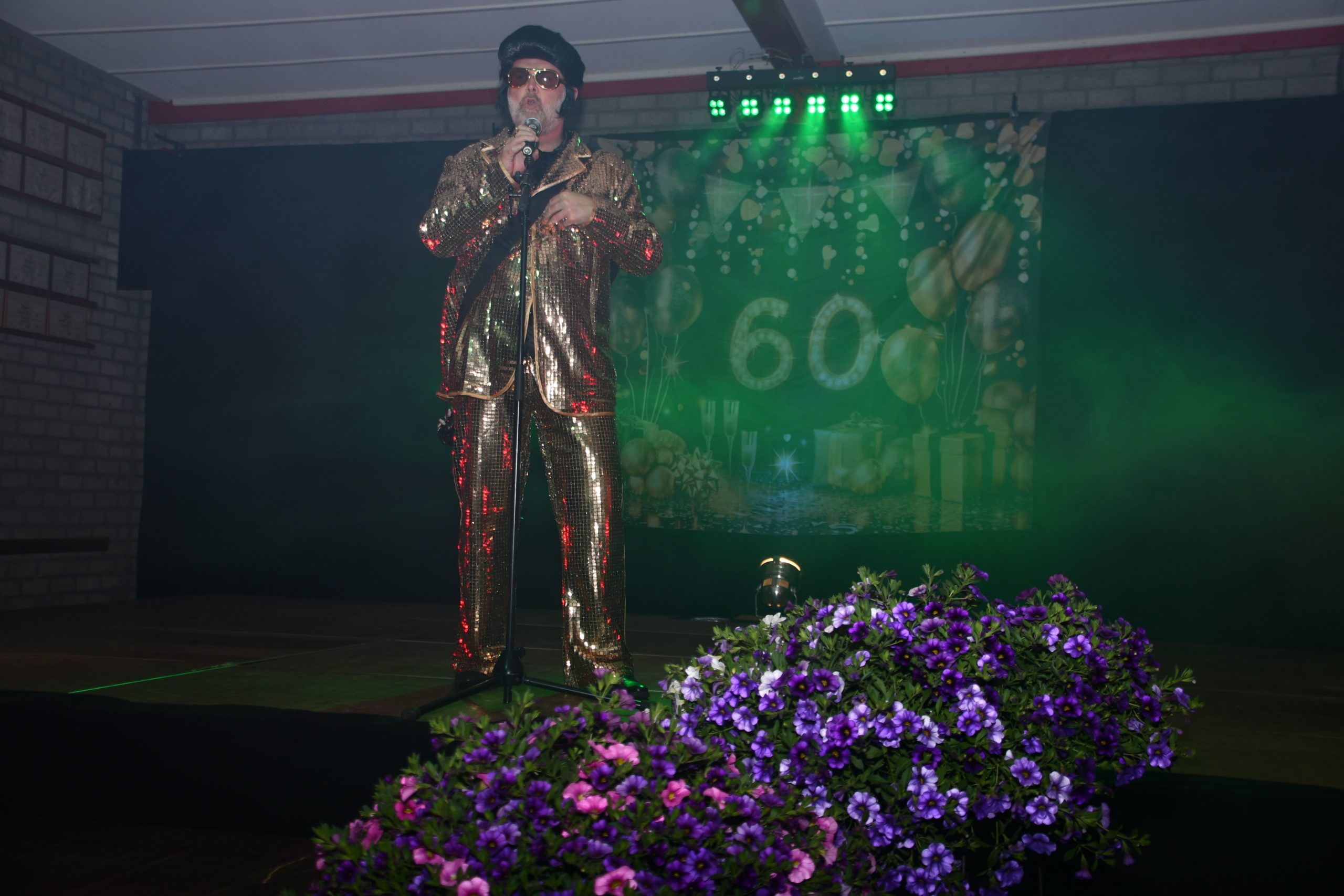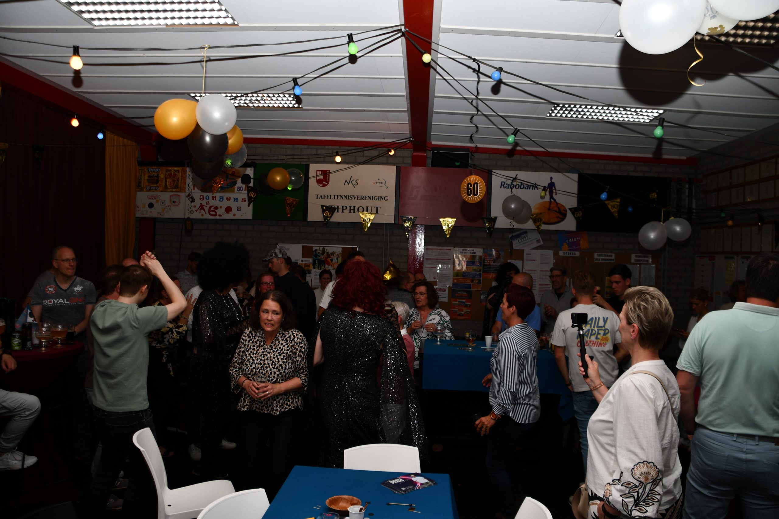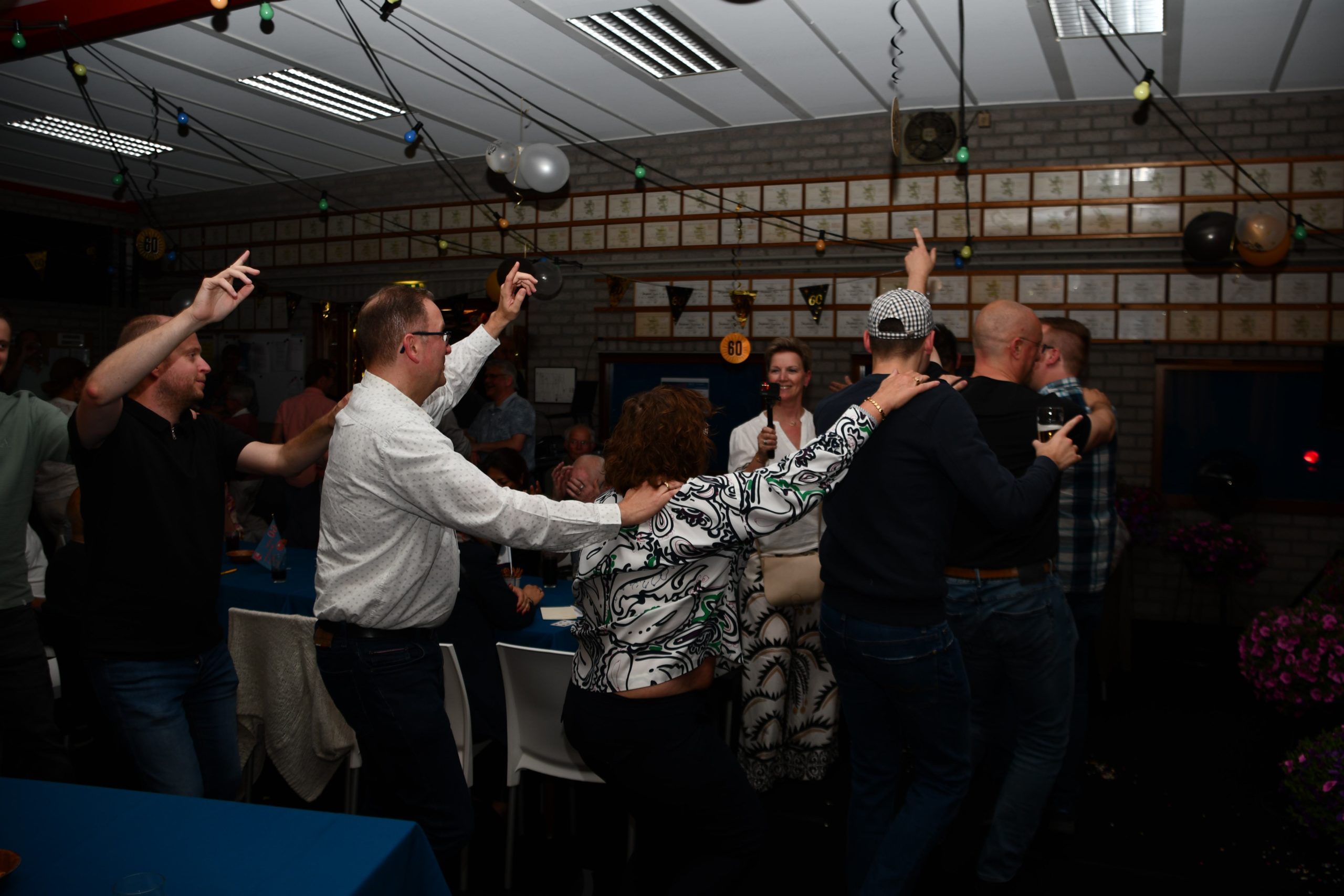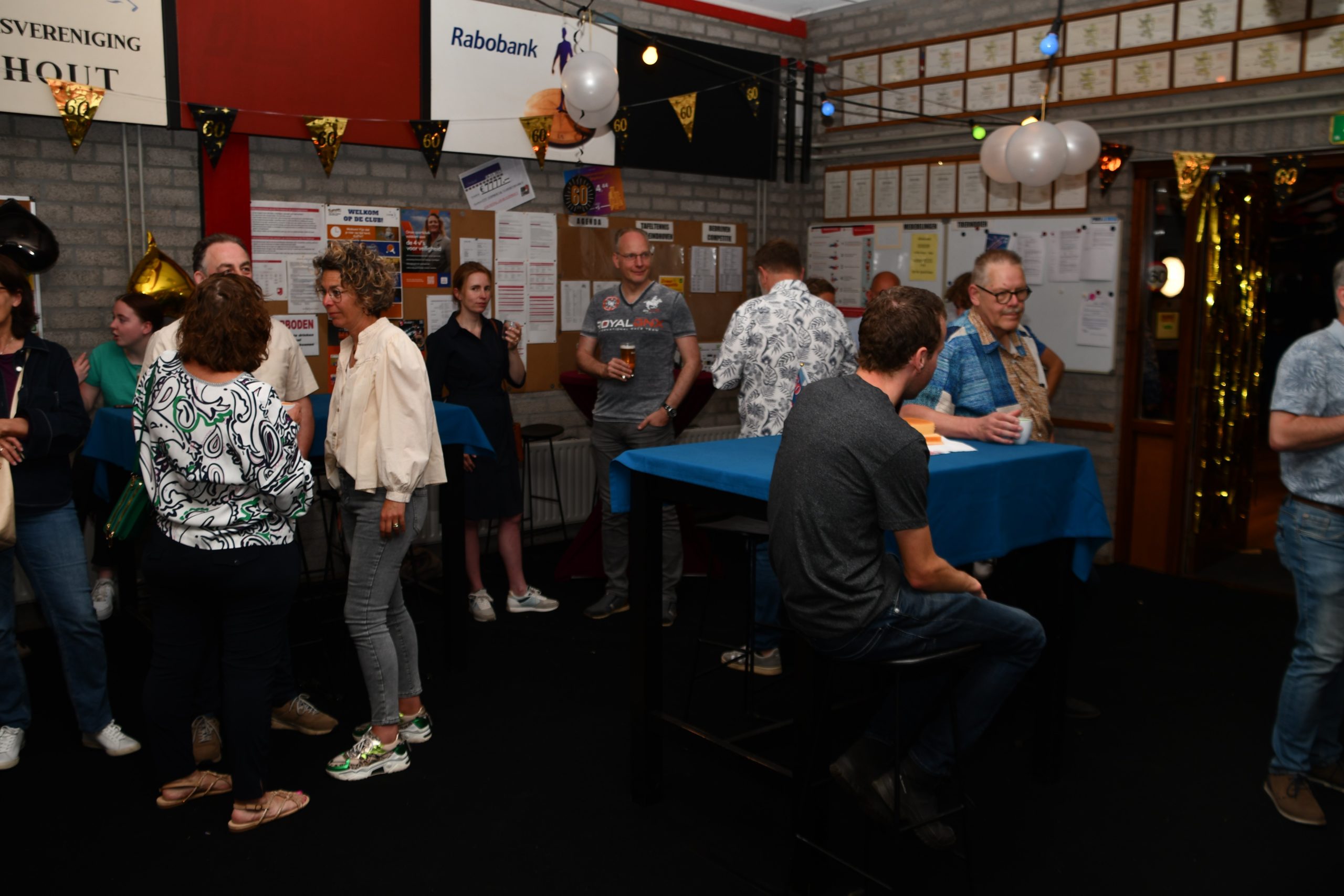 Dan is het tijd voor de hoofdact van de avond. Maurice Schalks maakt er een feestje van. Hij krijgt de zaal goed aan het dansen en mengt zich in het publiek. Zo ontstaat er al bij het eerste nummer een lange polonaise vol hossende en licht bezweette feestvierders. Ook hij moet even op adem komen en in de tussentijd kunnen we het enige kampioensteam van dit seizoen het podium op roepen: Stiphout 3! Ze hebben een topprestatie geleverd en ze gaan met een grote glimlach en een bierpakket onder de arm het podium weer af. Daarna is het de beurt aan Renée die al 40 jaar lid is van onze club. William haalt de oude herinneringen op met de zaal en ze krijgt dan ook een luid applaus en een bloemetje.