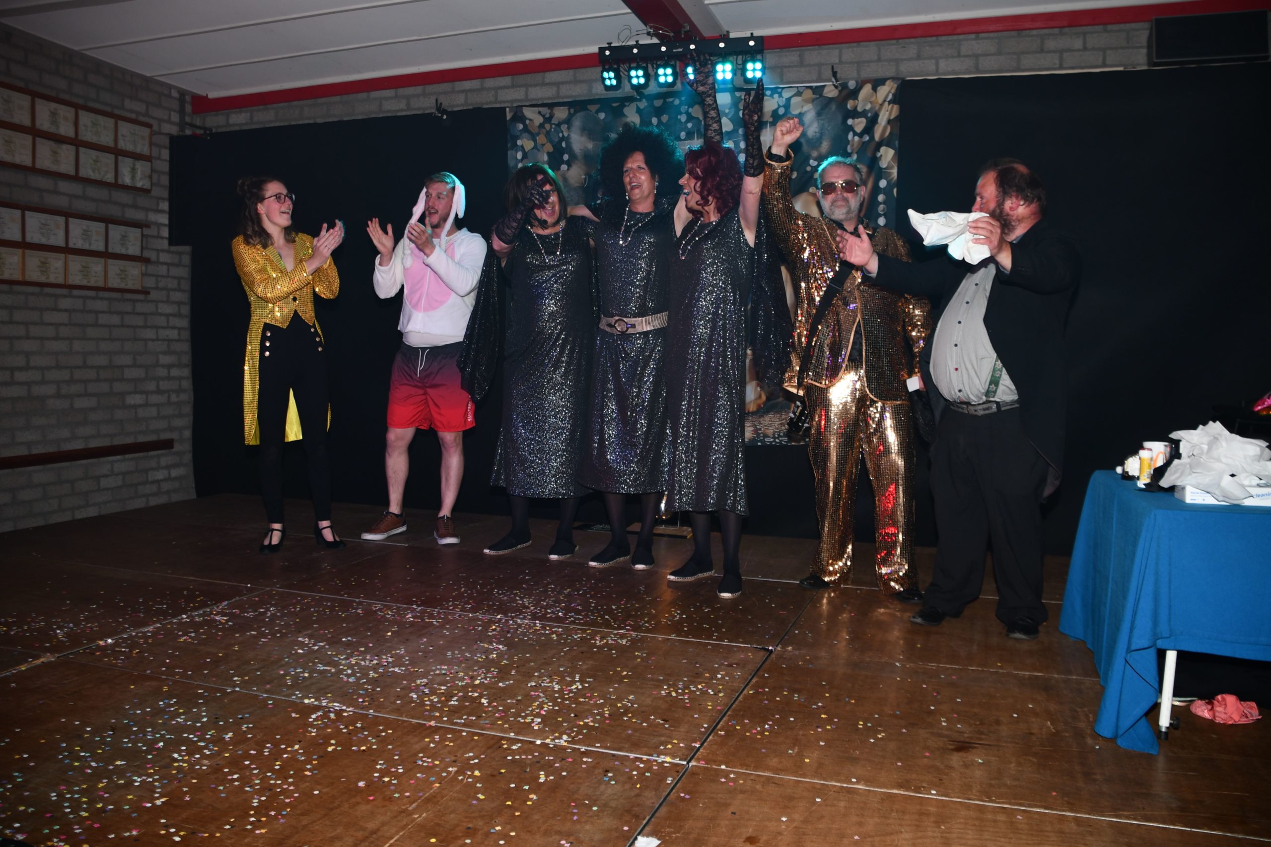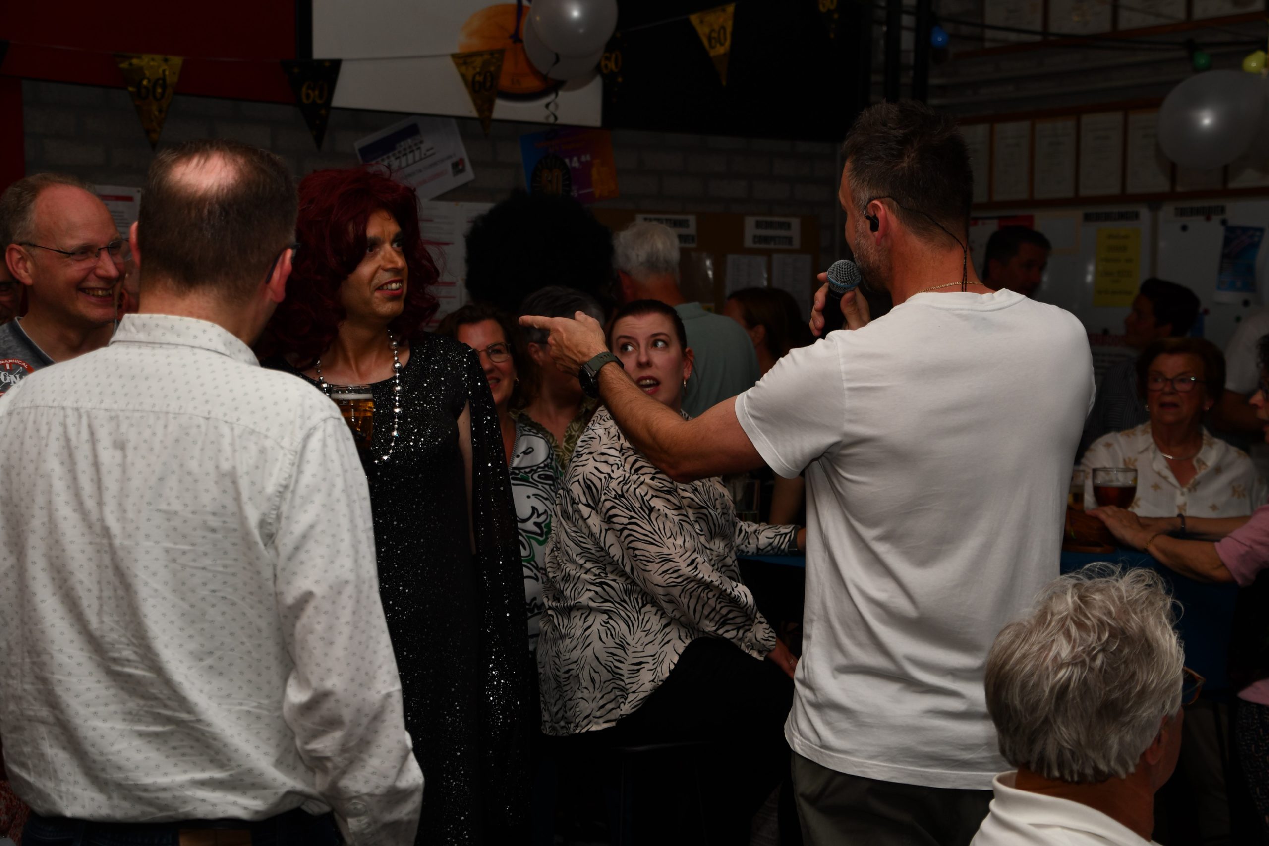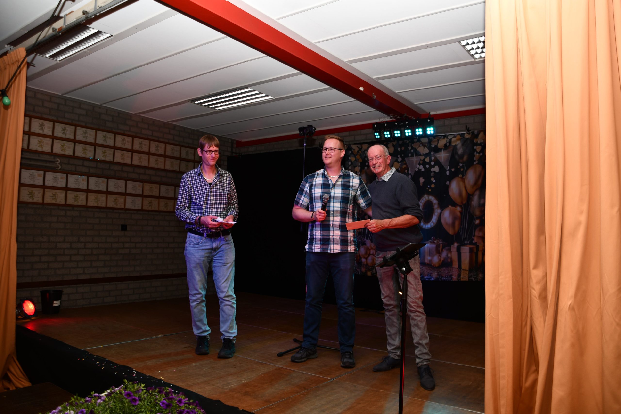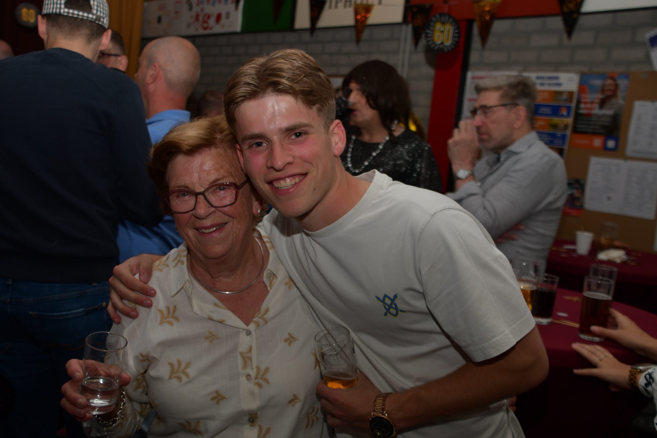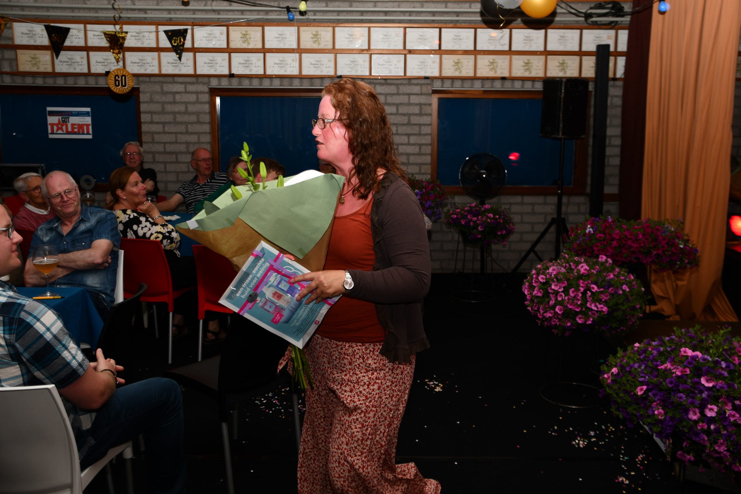 Dan is het tijd voor de hoofdact van de avond. Maurice Schalks maakt er een feestje van. Hij krijgt de zaal goed aan het dansen en mengt zich in het publiek. Zo ontstaat er al bij het eerste nummer een lange polonaise vol hossende en licht bezweette feestvierders. Ook hij moet even op adem komen en in de tussentijd kunnen we het enige kampioensteam van dit seizoen het podium op roepen: Stiphout 3! Ze hebben een topprestatie geleverd en ze gaan met een grote glimlach en een bierpakket onder de arm het podium weer af. Daarna is het de beurt aan Renée die al 40 jaar lid is van onze club. William haalt de oude herinneringen op met de zaal en ze krijgt dan ook een luid applaus en een bloemetje.