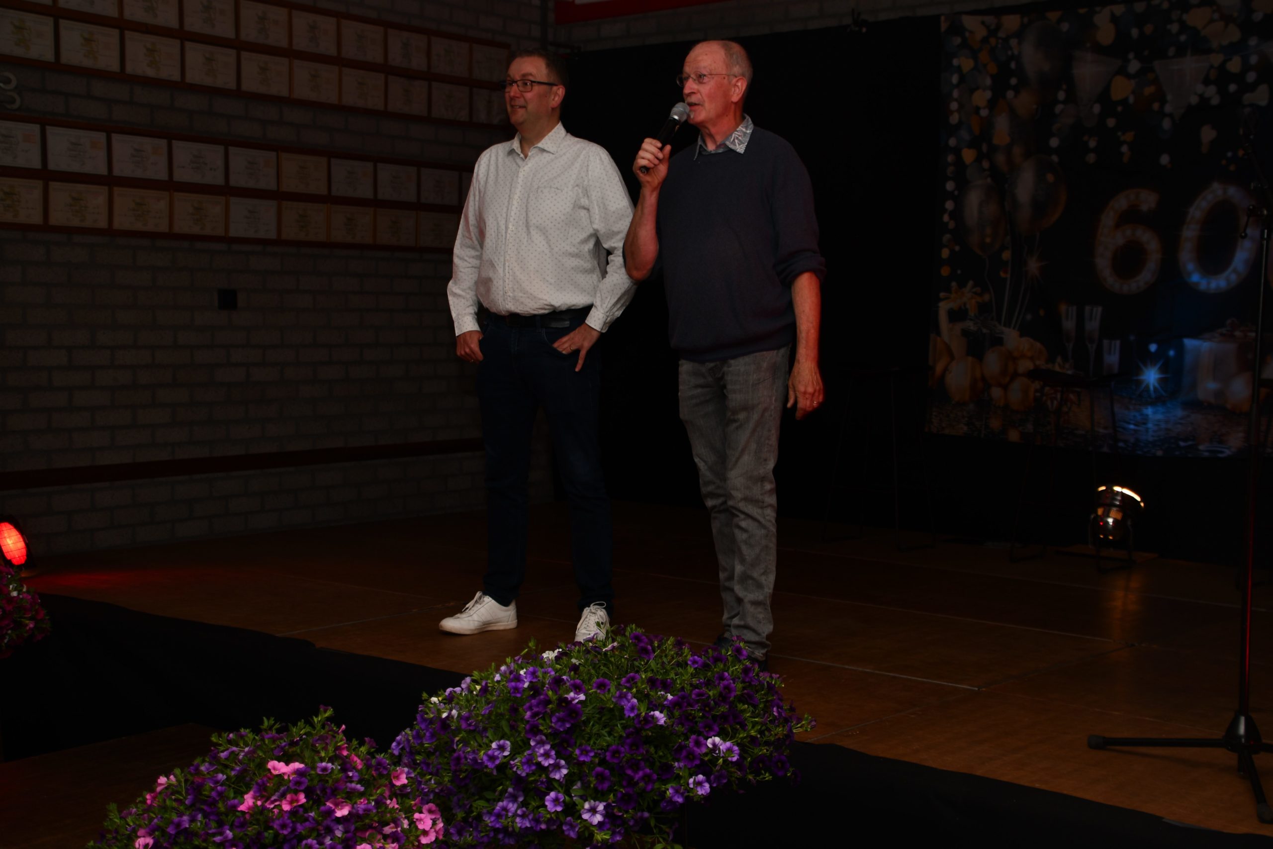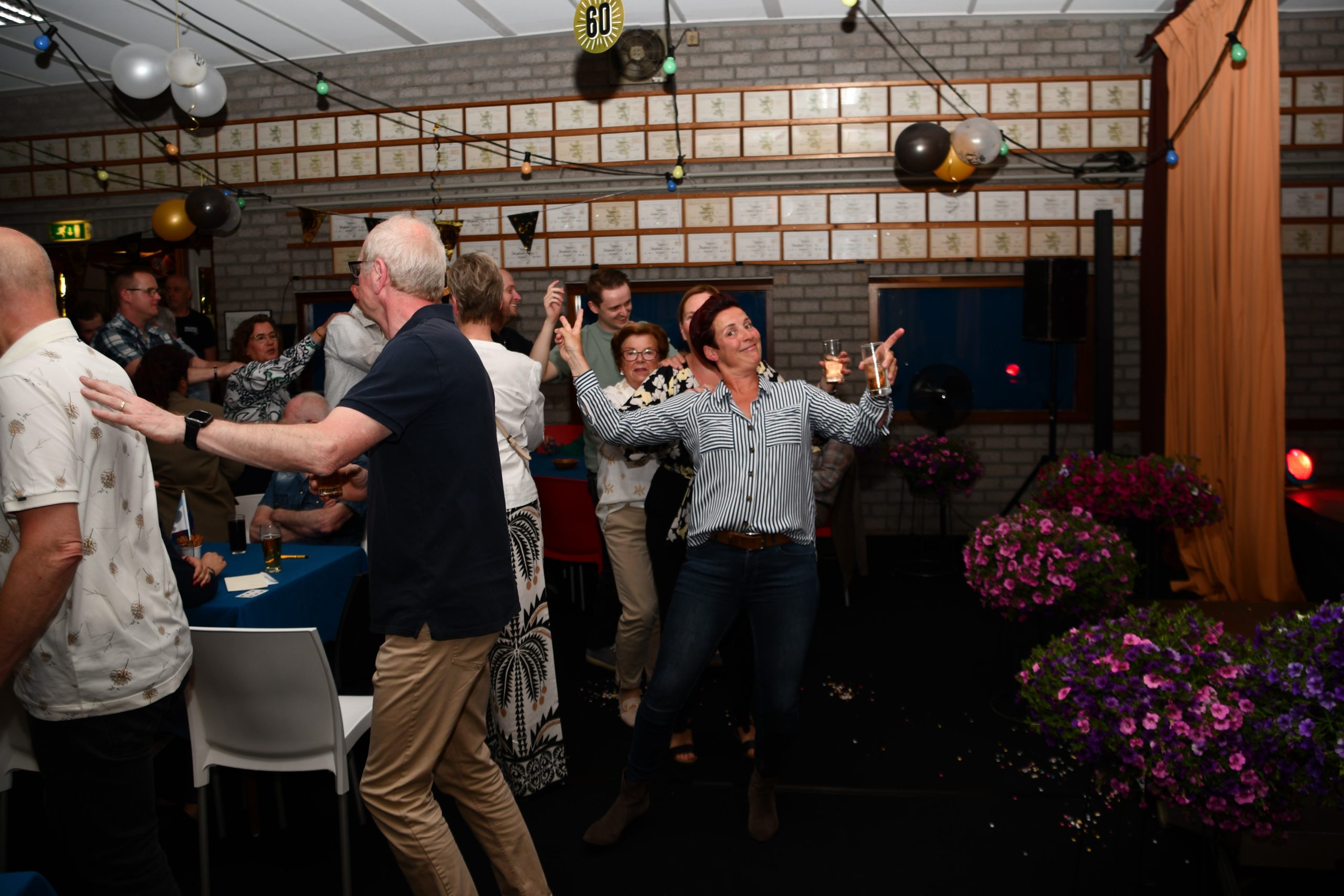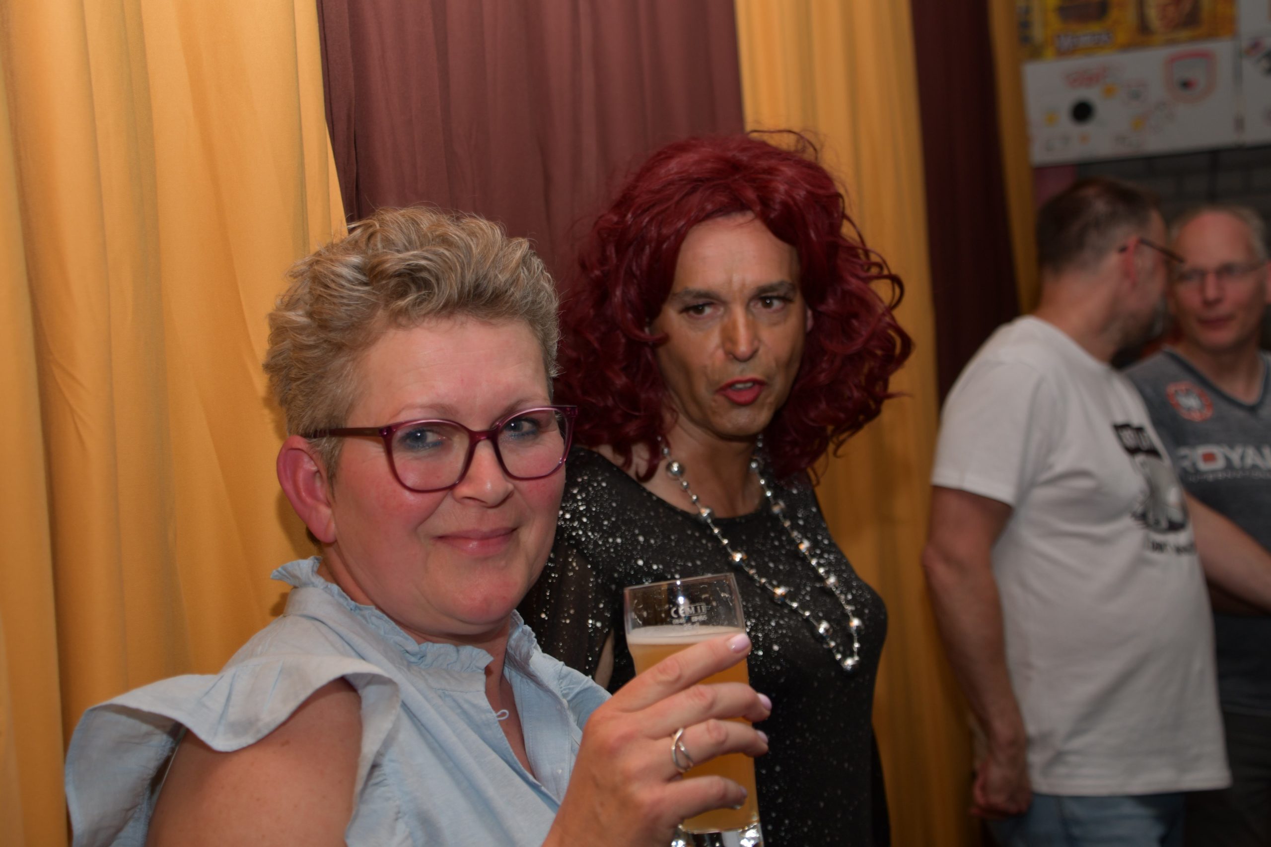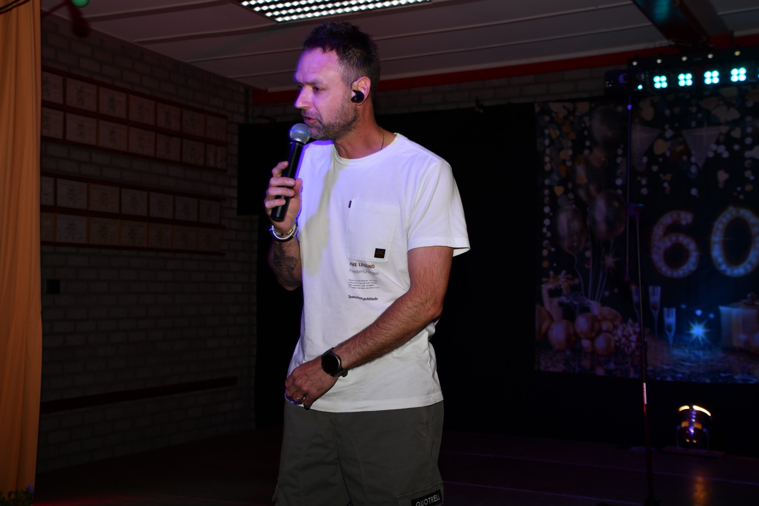 Dan is het tijd voor de hoofdact van de avond. Maurice Schalks maakt er een feestje van. Hij krijgt de zaal goed aan het dansen en mengt zich in het publiek. Zo ontstaat er al bij het eerste nummer een lange polonaise vol hossende en licht bezweette feestvierders. Ook hij moet even op adem komen en in de tussentijd kunnen we het enige kampioensteam van dit seizoen het podium op roepen: Stiphout 3! Ze hebben een topprestatie geleverd en ze gaan met een grote glimlach en een bierpakket onder de arm het podium weer af. Daarna is het de beurt aan Renée die al 40 jaar lid is van onze club. William haalt de oude herinneringen op met de zaal en ze krijgt dan ook een luid applaus en een bloemetje.
