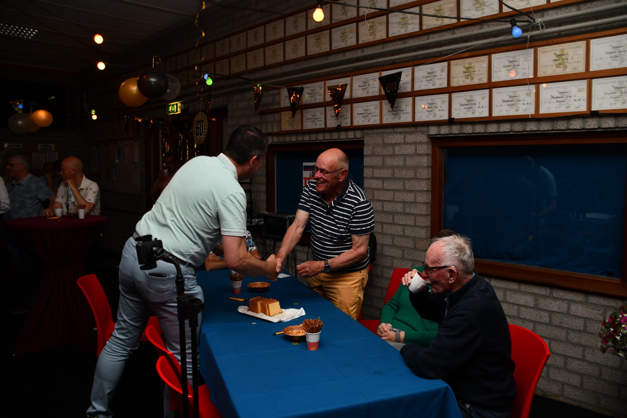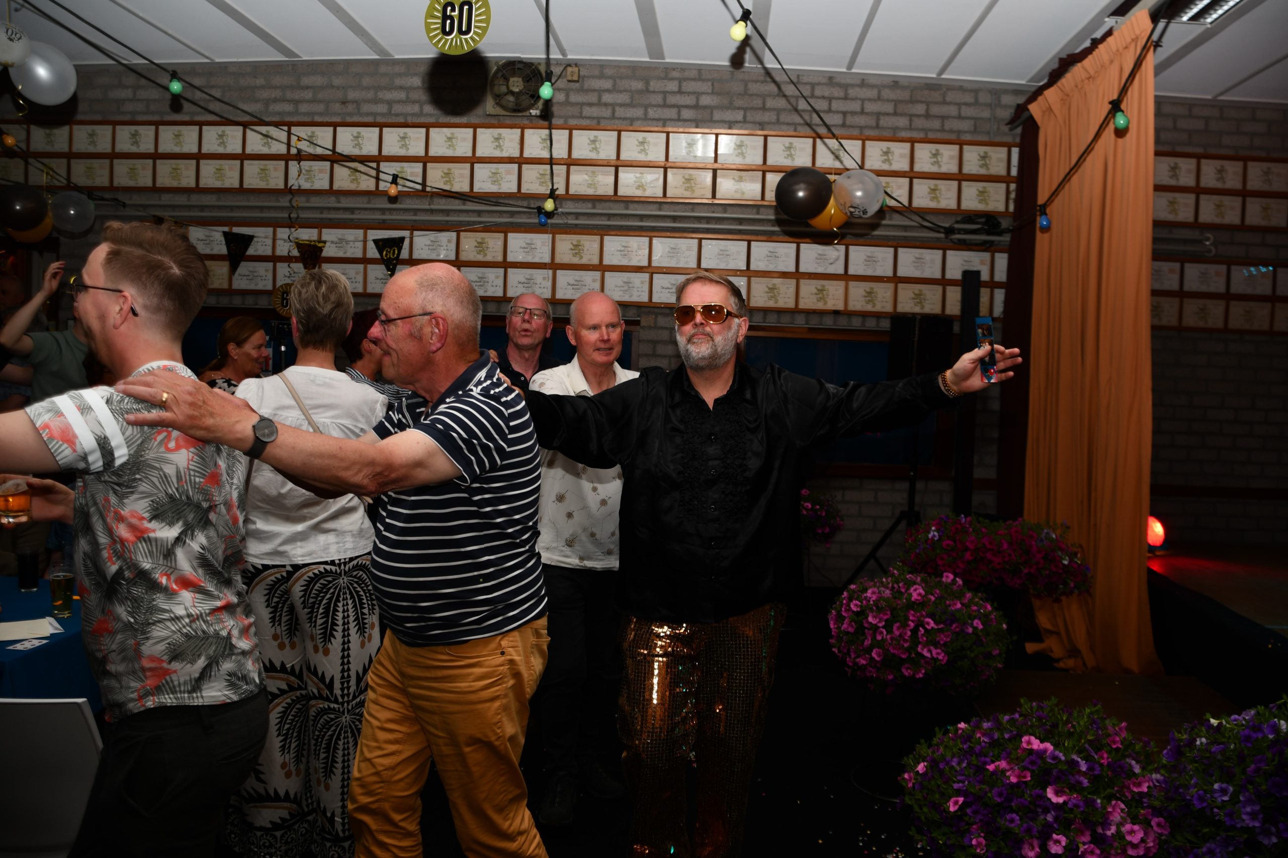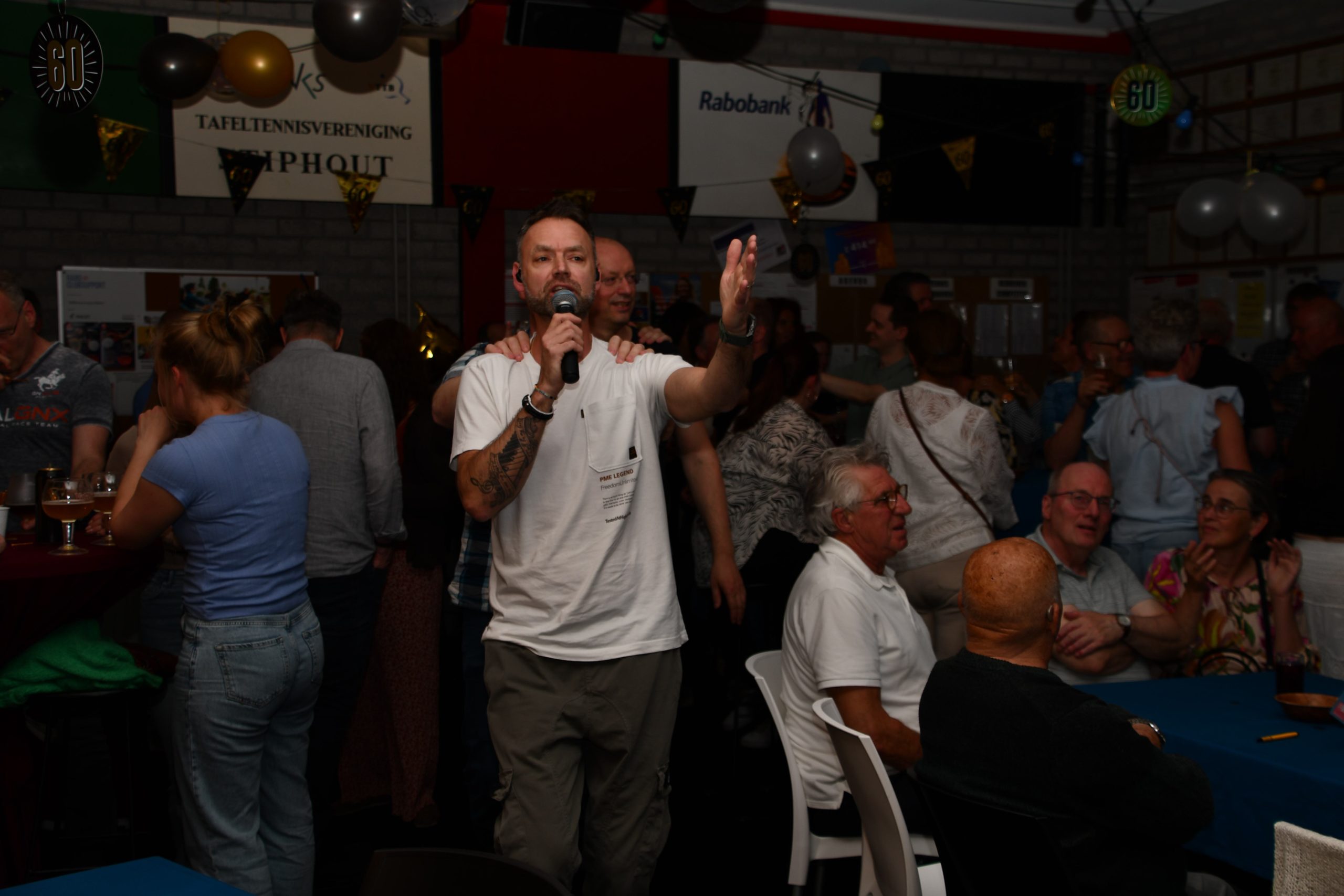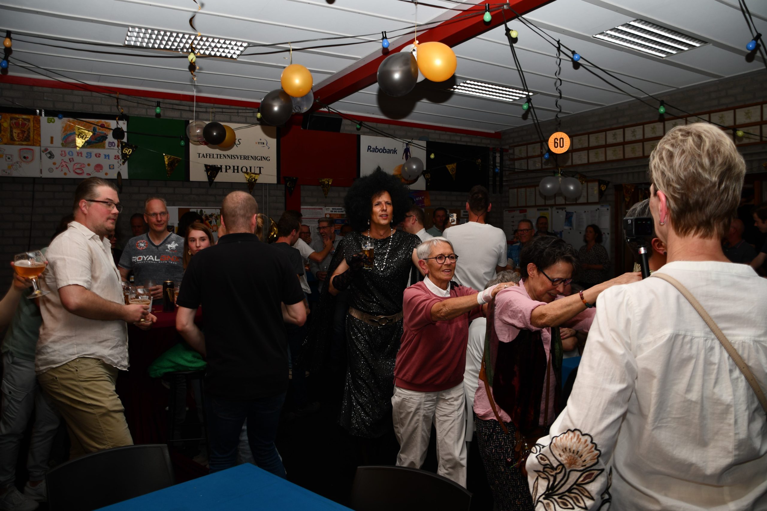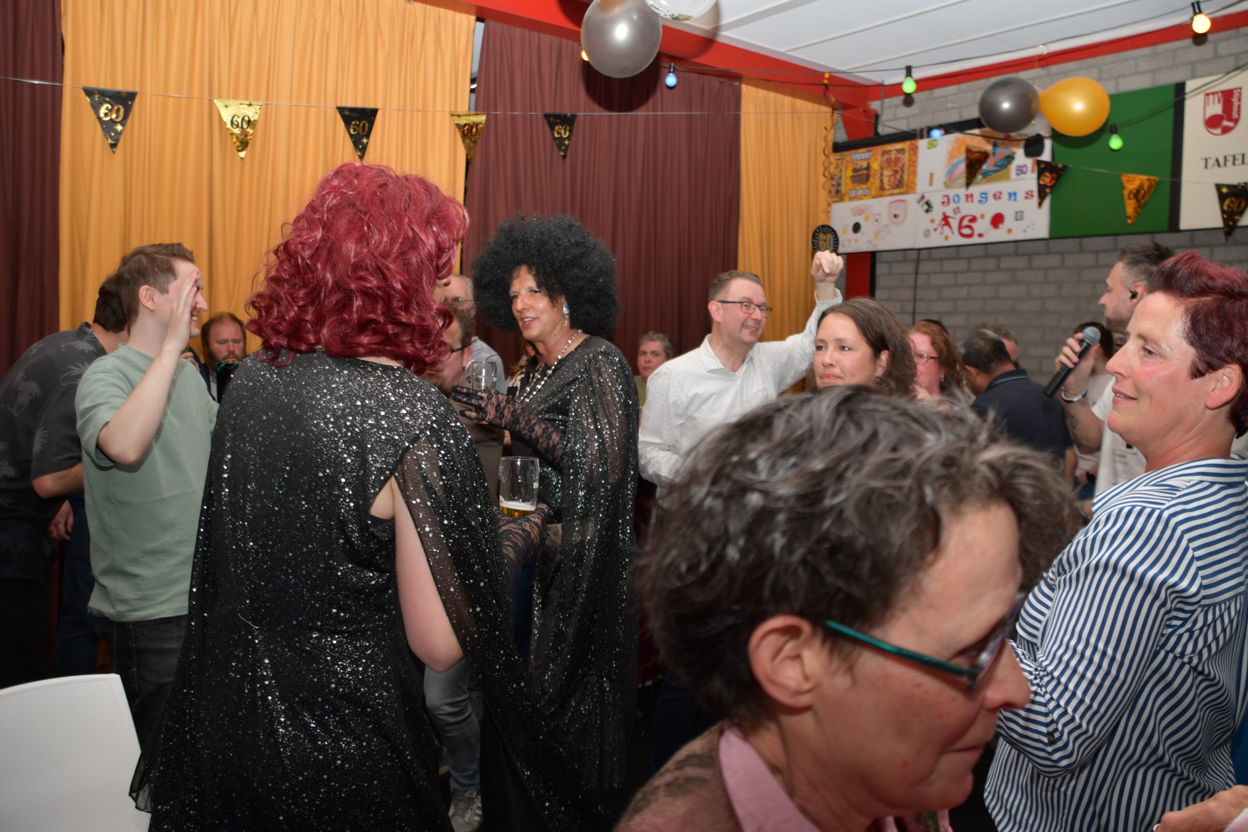 Dan is het tijd voor de hoofdact van de avond. Maurice Schalks maakt er een feestje van. Hij krijgt de zaal goed aan het dansen en mengt zich in het publiek. Zo ontstaat er al bij het eerste nummer een lange polonaise vol hossende en licht bezweette feestvierders. Ook hij moet even op adem komen en in de tussentijd kunnen we het enige kampioensteam van dit seizoen het podium op roepen: Stiphout 3! Ze hebben een topprestatie geleverd en ze gaan met een grote glimlach en een bierpakket onder de arm het podium weer af. Daarna is het de beurt aan Renée die al 40 jaar lid is van onze club. William haalt de oude herinneringen op met de zaal en ze krijgt dan ook een luid applaus en een bloemetje.