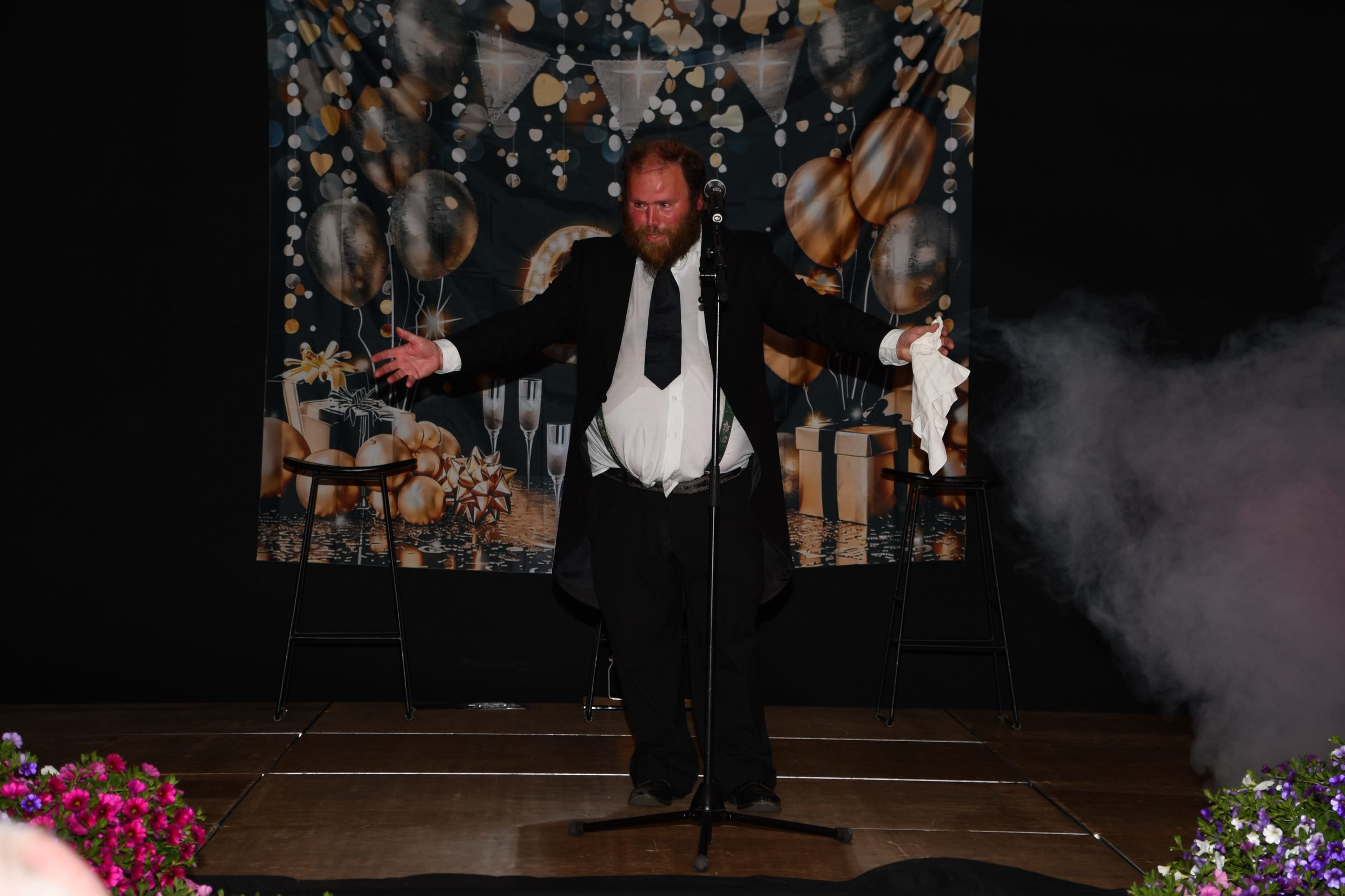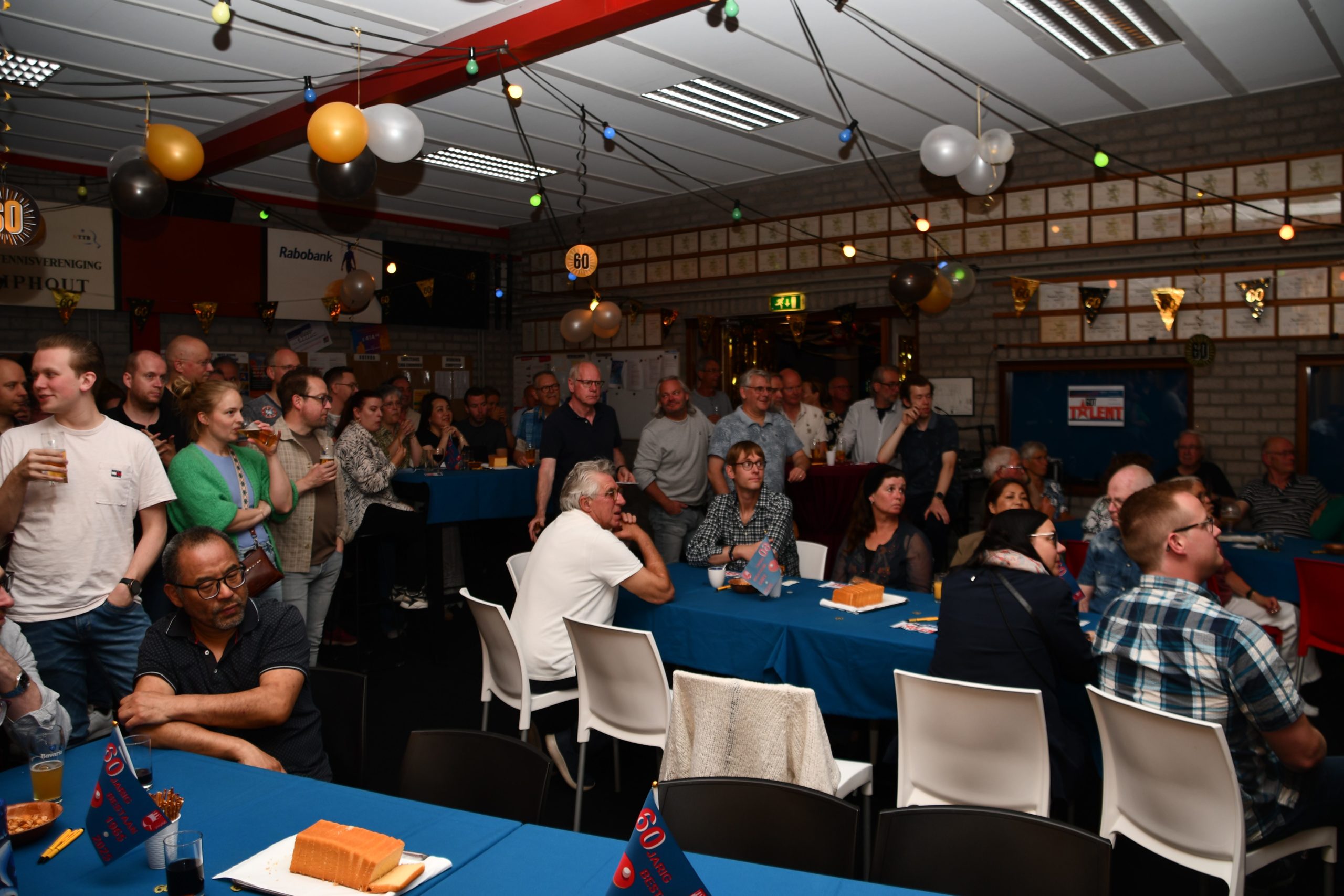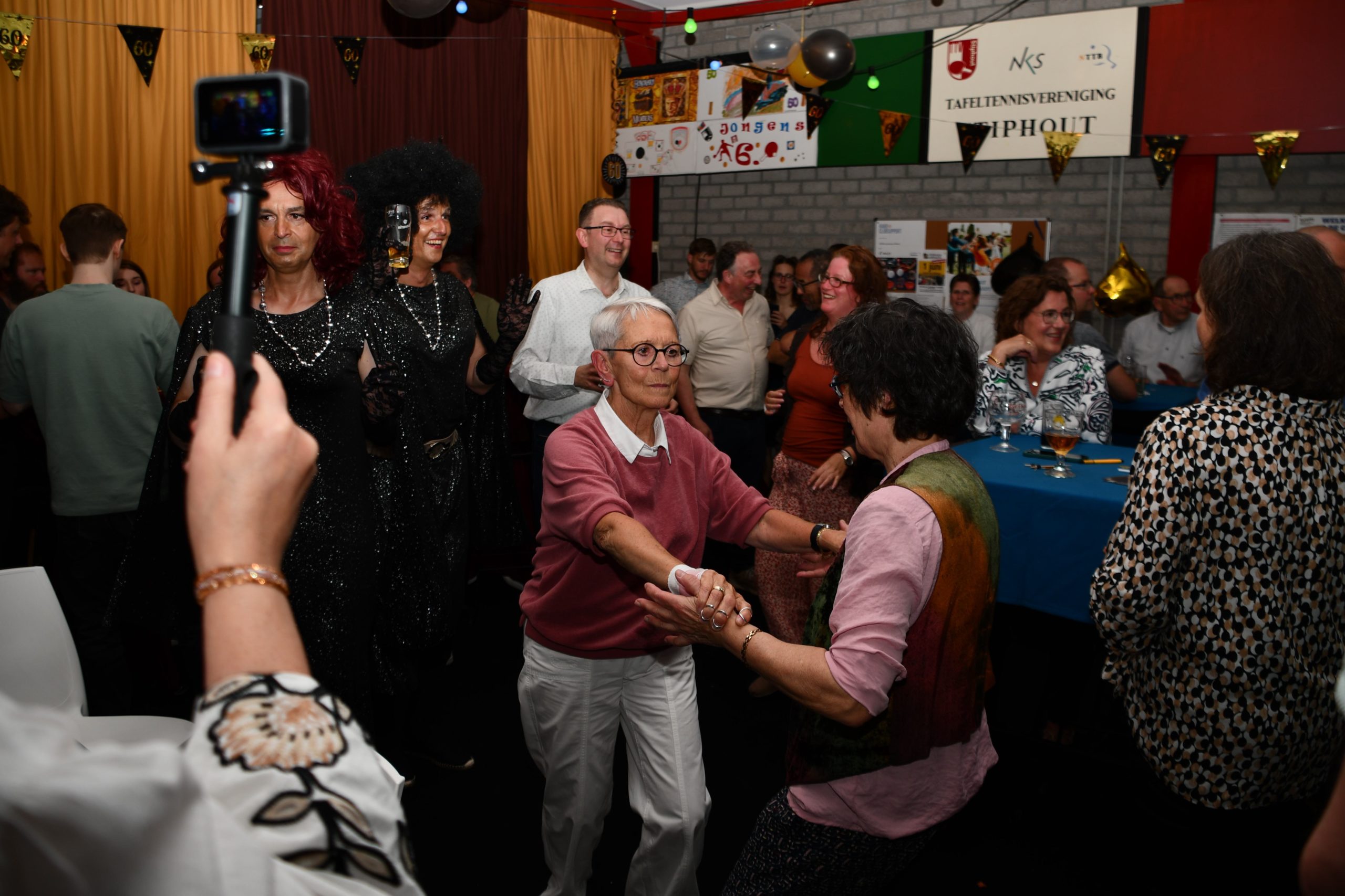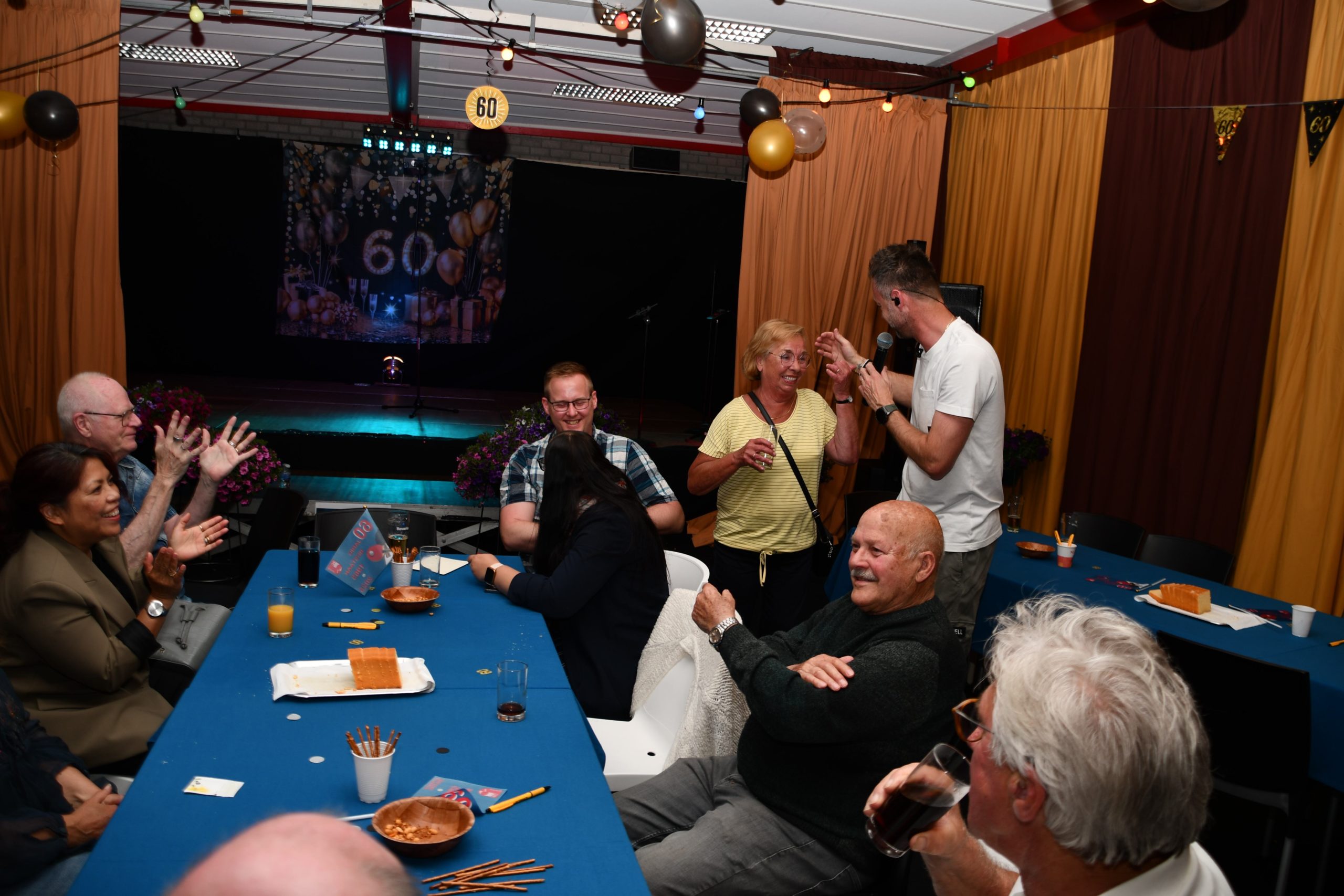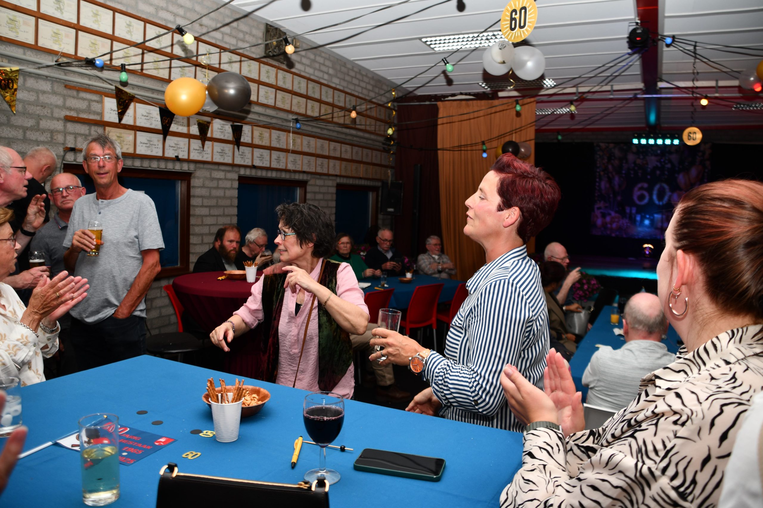 Dan is het tijd voor de hoofdact van de avond. Maurice Schalks maakt er een feestje van. Hij krijgt de zaal goed aan het dansen en mengt zich in het publiek. Zo ontstaat er al bij het eerste nummer een lange polonaise vol hossende en licht bezweette feestvierders. Ook hij moet even op adem komen en in de tussentijd kunnen we het enige kampioensteam van dit seizoen het podium op roepen: Stiphout 3! Ze hebben een topprestatie geleverd en ze gaan met een grote glimlach en een bierpakket onder de arm het podium weer af. Daarna is het de beurt aan Renée die al 40 jaar lid is van onze club. William haalt de oude herinneringen op met de zaal en ze krijgt dan ook een luid applaus en een bloemetje.