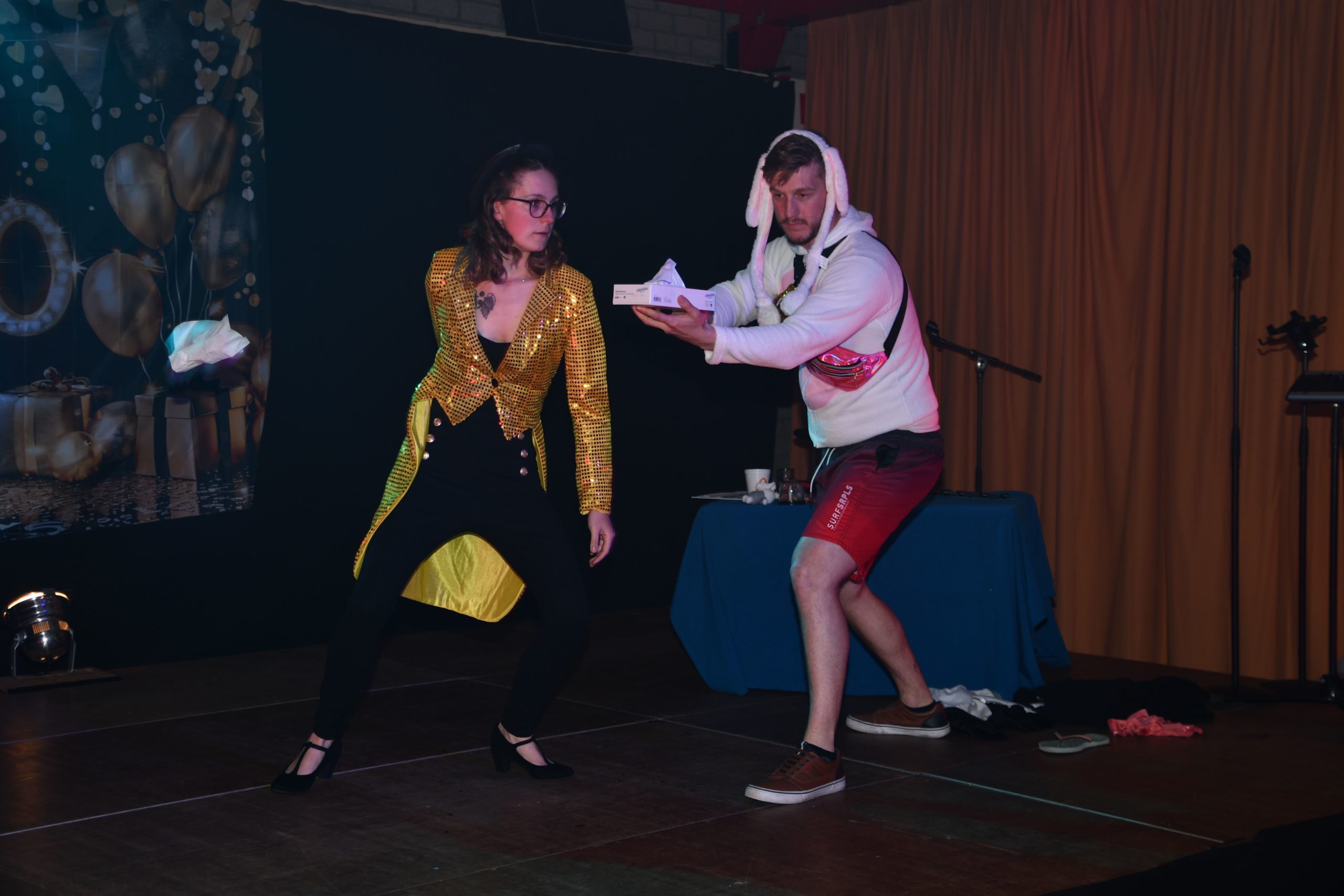 William en Frenklin openen de feestavond met een welkomstwoordje in het Nederlands en Duits en dan is Chantal Janzen aan het woord voor de presentatie van de talentenjacht!
