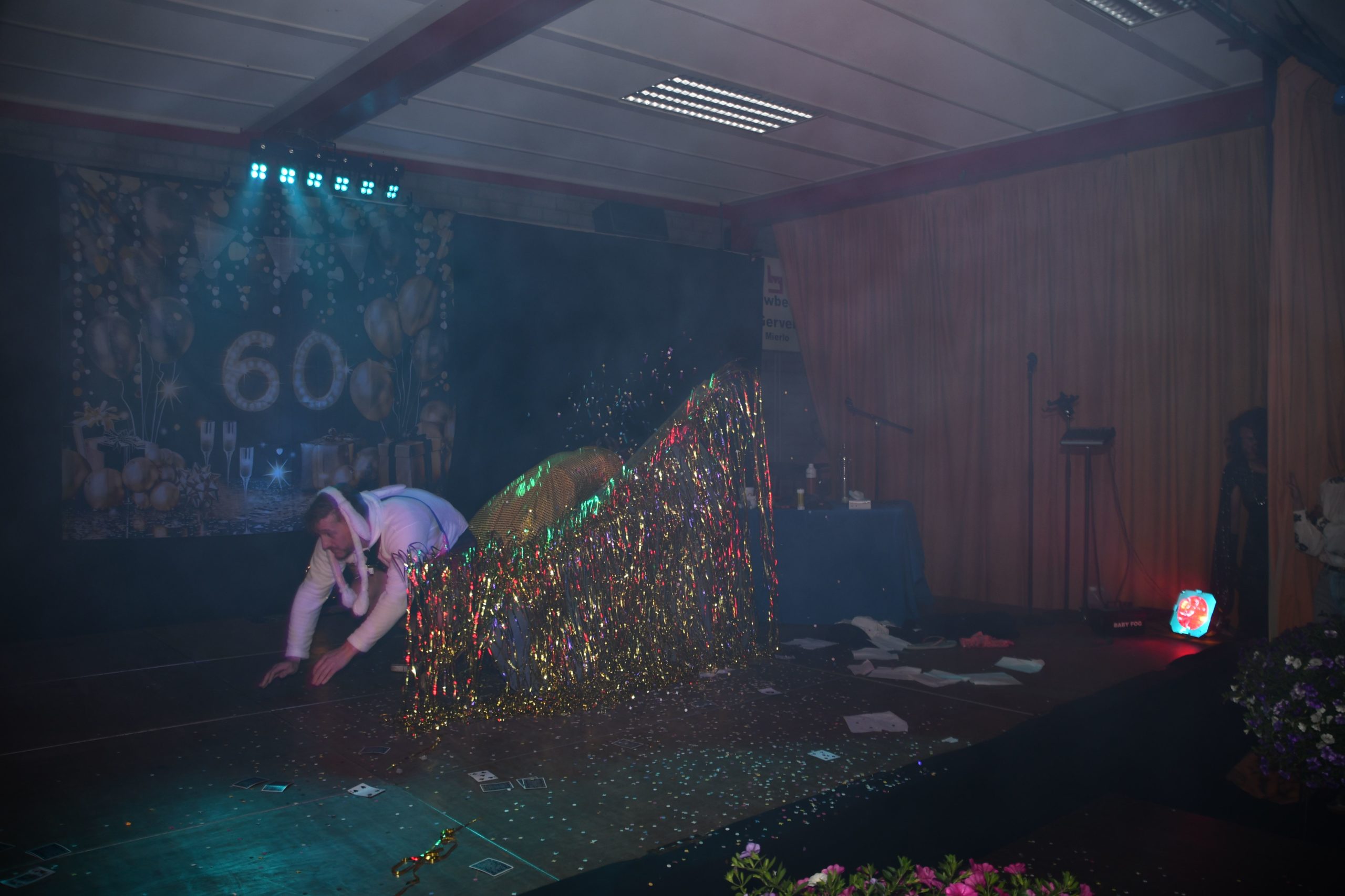 Het podium zit weer goed in elkaar, de gordijnen hangen kaarsrecht en de zaal is prachtig aangekleed. Hartelijk dank aan de onderhoudsploeg, de feestcommissie en de organisatoren. Maar ook speciaal dank aan Kwekerij Van der Linden voor de prachtige kleurrijke bloemenbaskets!