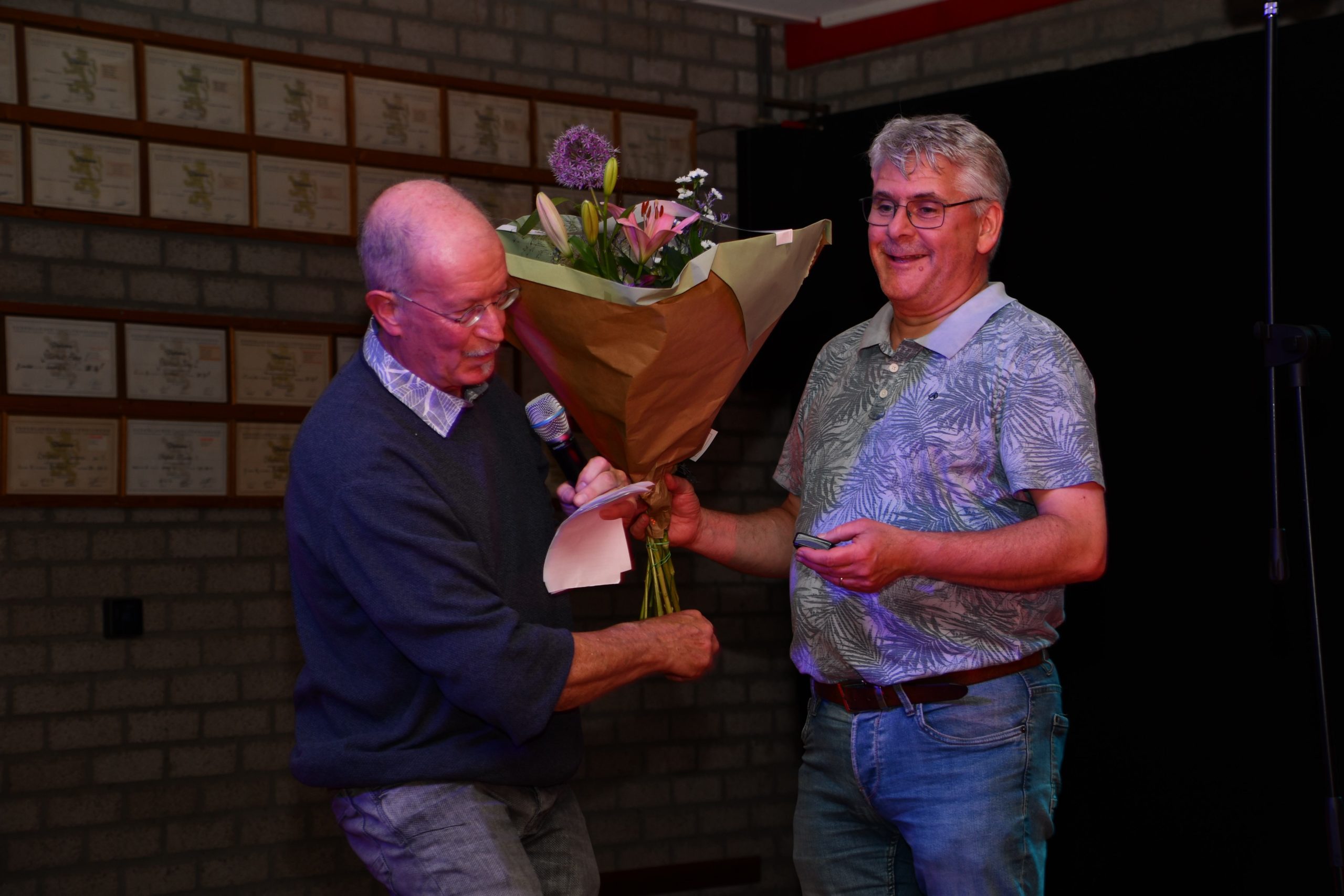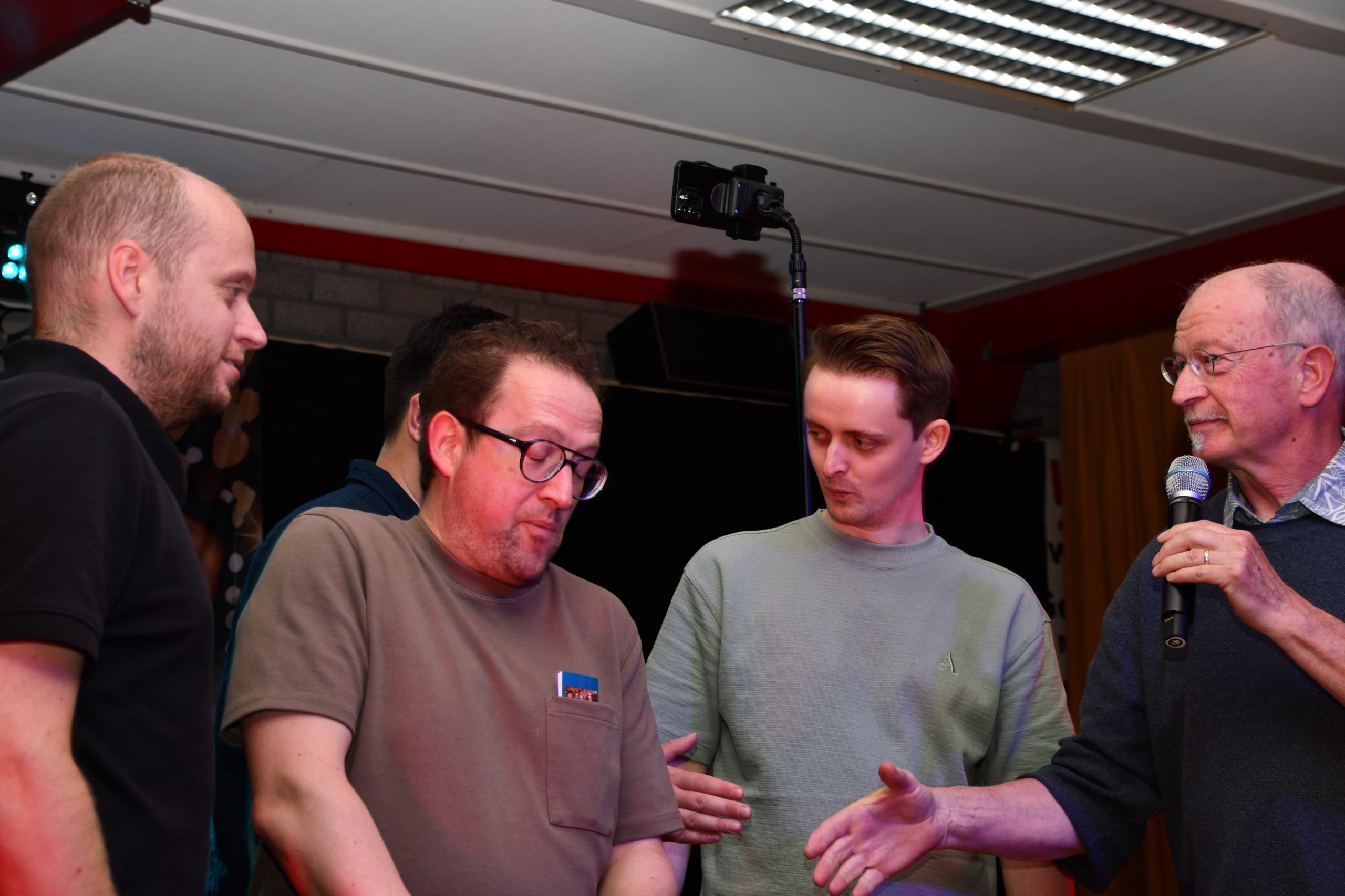 Nietsvermoedend staat Roger opeens op het podium om zonder het te weten de verenigingsspeld te ontvangen van de voorzitter.