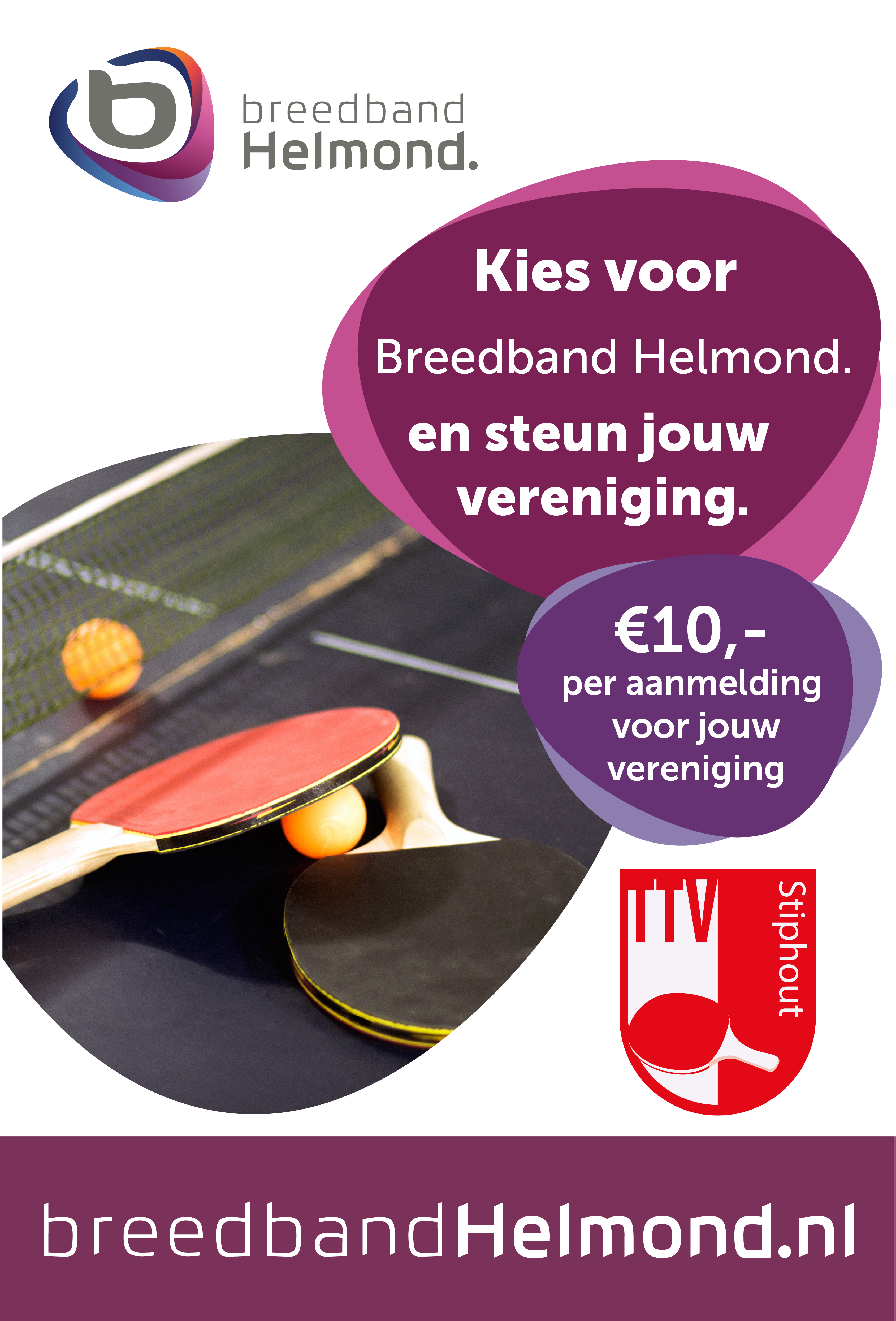 Breedband Helmond is rolling out its fiber optic network further in Helmond. If you are now subscribing to the fiber optic connection of Breedband Helmond, please indicate this on your registration form (association TTV Stiphout). TTV Stiphout will receive € 10,- from Breedband Helmond for each connection that TTV Stiphout indicates on the registration form!